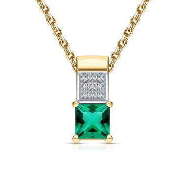 Подвеска с 9 бриллиантами, огранка круг 17 граней, 0.02 карат, цвет 2, чистота 2, тип огранки А; 1 гидротермальным изумрудом, 0.263 карат, тип огранки Б; Желтое золото 585 пробы.