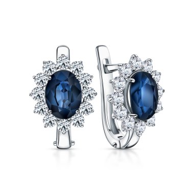Серьги с 24 бриллиантами, огранка круг 57 граней, 1.091 карат, цвет 3, чистота 6, тип огранки А; 2 сапфирами, 3.041 карат, цвет 2, чистота 2, тип огранки Б; Белое золото 585 пробы.