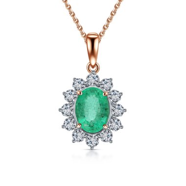 Подвеска с 10 бриллиантами, огранка круг 57 граней, 0.386 карат, цвет 3, чистота 6, тип огранки А; 1 изумрудом, 0.78 карат, цвет 3, чистота 3, тип огранки Б; Розовое золото 585 пробы.