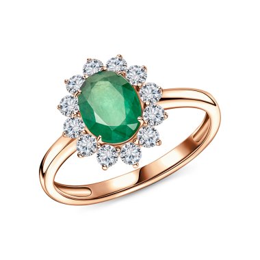 Кольцо с 12 бриллиантами, огранка круг 57 граней, 0.534 карат, цвет 3, чистота 6, тип огранки А; 1 изумрудом, 1.16 карат, цвет 3, чистота 3, тип огранки Б; Розовое золото 585 пробы.