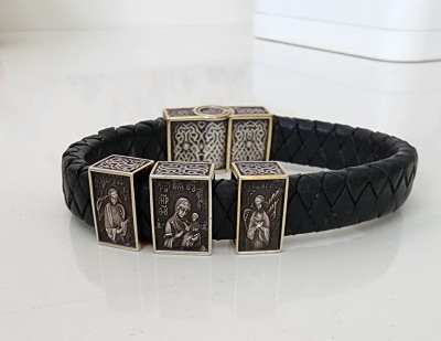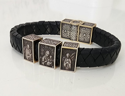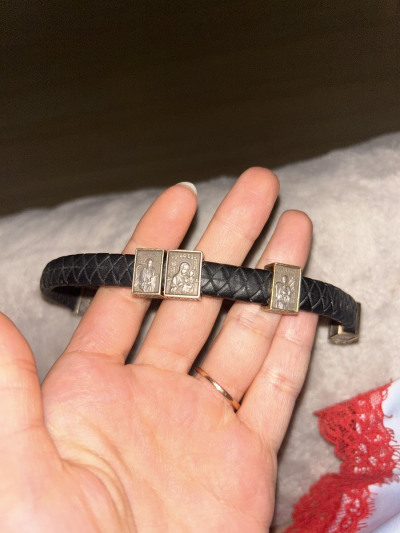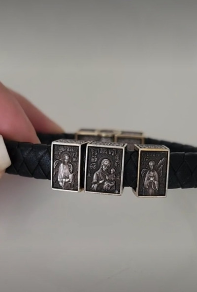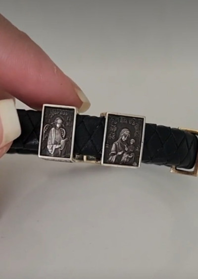 На кожаный браслет помещены три подвески – икона Пресвятой Богородицы «Всецарица» («Пантанасса»), на которой Пресвятая Богородица изображена с Сыном Божьим на руках, восседающая на троне; а по бокам ангелы, что, распустив крыла, осеняют Богородицу.