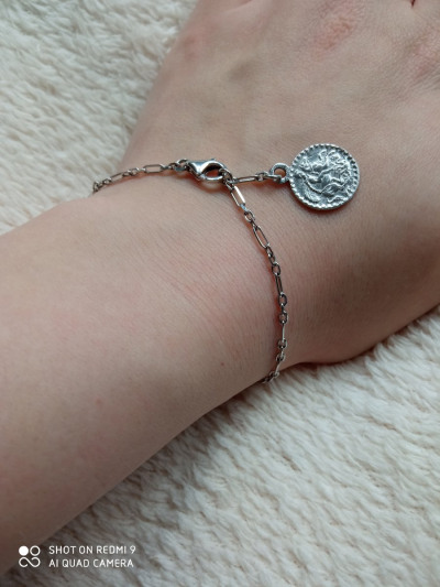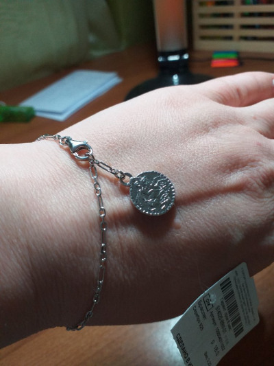 Заказывала этот браслет, потому что люблю всякие висюльки. Монетка смотрится интересно. Лёгкий, тонкий, красиво блестит на солнце.