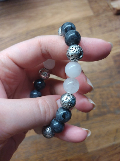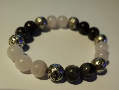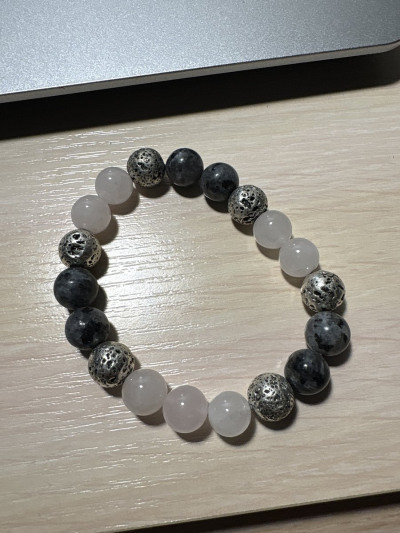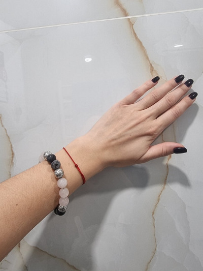 Стальной браслет с лавовым камнем, кварцами природными и кварцами розовыми