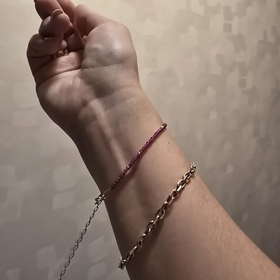 Милый, небольшой, но изящный браслетик. Будет смотреться на тонком запястье с нежным маникюром. Не блестит 💖, матовый, если для кого этот момент принципиален, но стоит своих денег.