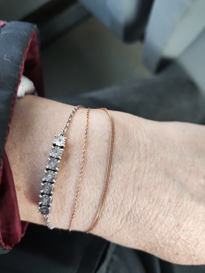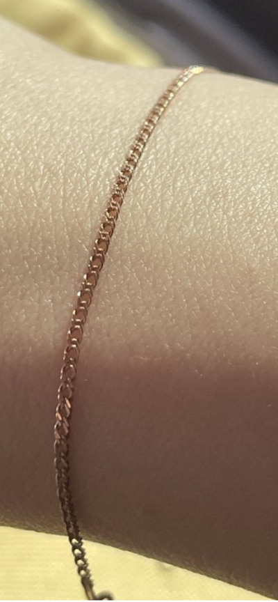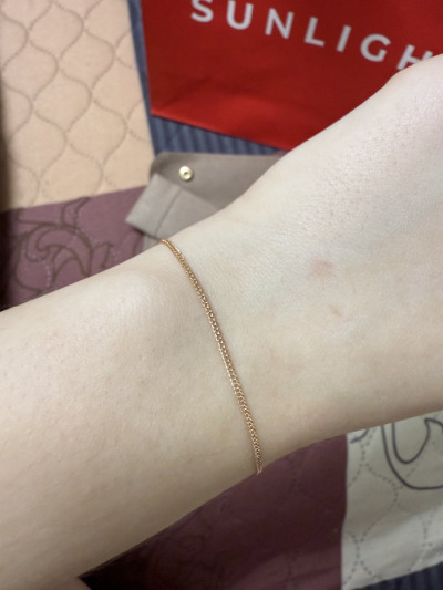 Покупала браслет на день рождения. Тоненький,но красивый. Ношу 2 года не снимая,жалко что растянулся.