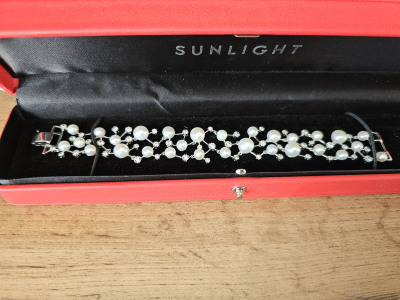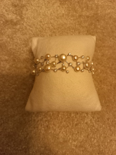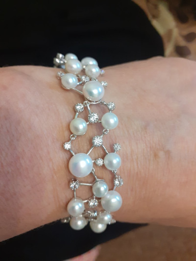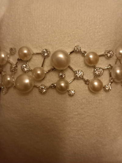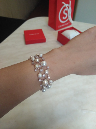 Серебряный браслет с жемчугом и фианитами очень красивый. Собрала всю коллекцию, глядя, на отзывы и фото одной девушки, у которой и браслет и все остальное из этой коллекции и мне захотелось. Только серьги другие выбрала. Красивый, необычный, праздничный, заметный.