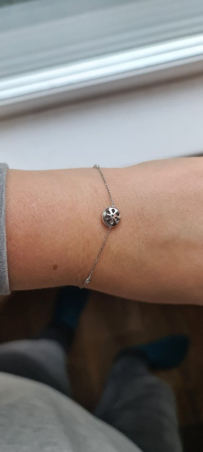 Нежный, милый, утонченный. Минималистичный дизайн и ничего лишнего. Браслетом довольна, переживаю только, что плетение тонкое, есть опасение, что можно порвать. Жаль, что не было колье к нему, в тандеме было бы круто примерить в магазине.