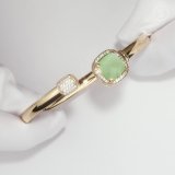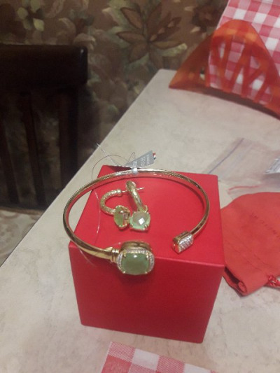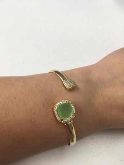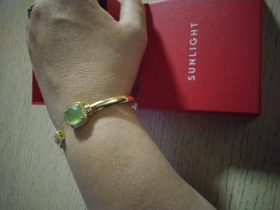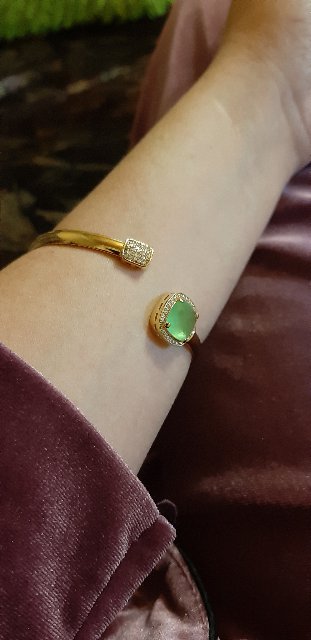Интересный на руке браслет. Лимонная позолота выгодно оттеняет яркий зелёный кварц, верно расставляя акцент. На руке не крутится, т.к. У браслета очень продуманная форма. Я довольна и покупкой, и обслуживанием - спасибо продавцу-консультанту эльвире!
