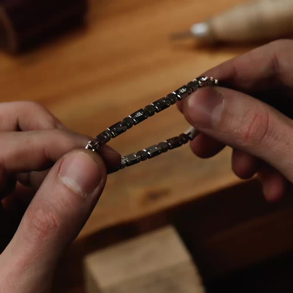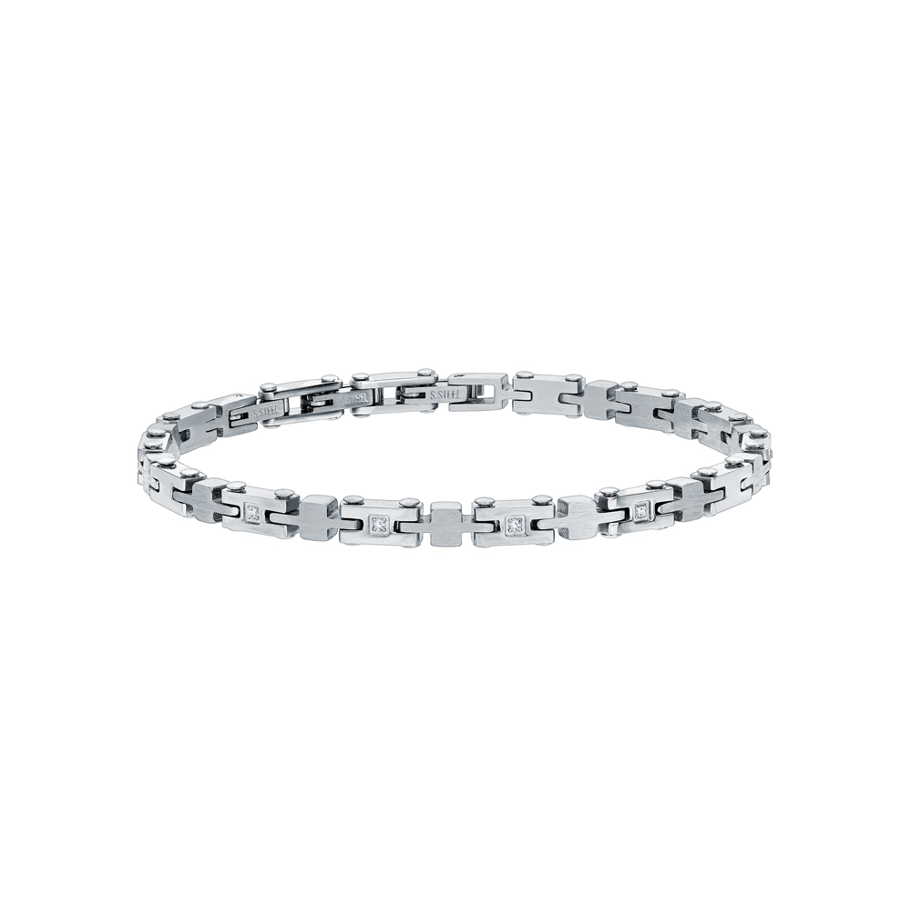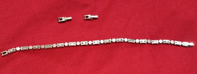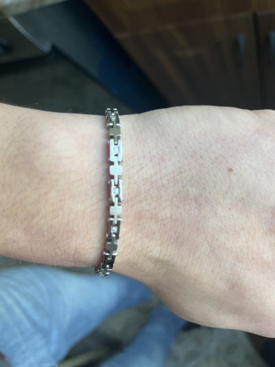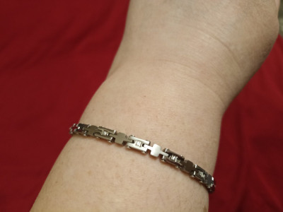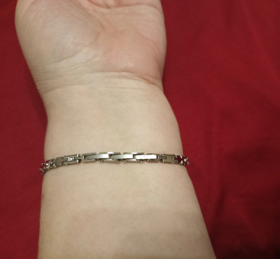Купила симпатичный браслет размера 23. На руке смотрится лаконично. Имеются два съёмных застёгивающихся сегмента, за счёт которых браслет можно сделать длиннее или короче, что очень удобно. Замочек надёжный, плотно застёгивается. Звенья браслета, в зависимости от формы, имеют разную полировку. Пикантность придаёт инкрустация мелкими прозрачными фианитами. Покупкой довольна. Нравится.