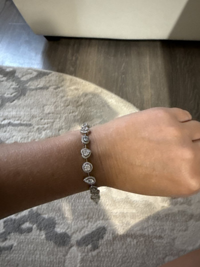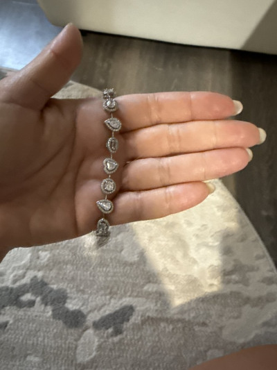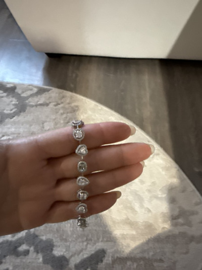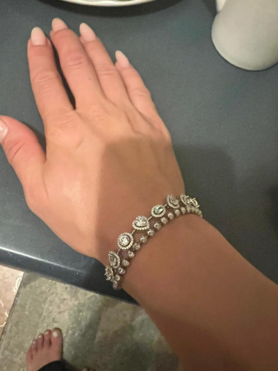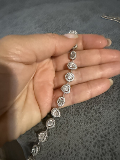 Засматривалась на сайте. В магазине думала, что эффект присутствия и спешки, поэтому и не получается застегнуть-расстегнуть без помощи продавца. Дома рассмотрела вблизи и понравился ещё больше: топаза три и они еда голубые, блестел красиво, но оказался велик, не смотря на размер вставок, и с замком одной рукой управиться так и не смогла.