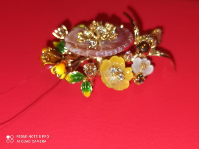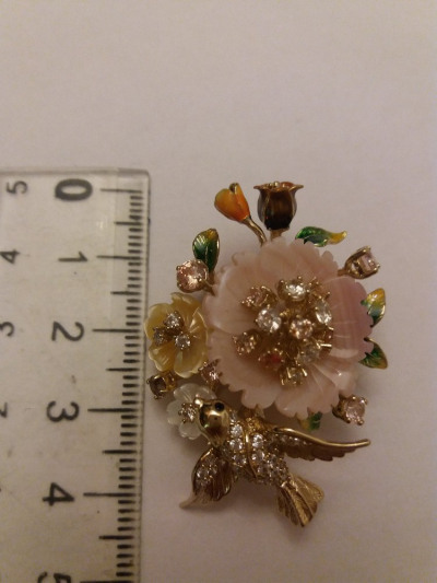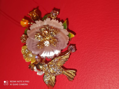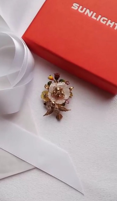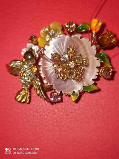 Брошь во флористическом стиле с цветами из перламутра и эмали, со вставками из разноцветных, переливающихся фианитов. Очень удобно,что изделие можно носить и как брошь,и как подвеску. Покупала 6 лет назад. Красивый, внешний вид, не меняющийся с годами. Покупкой очень довольна! Спасибо дизайнерам Sunlight☀