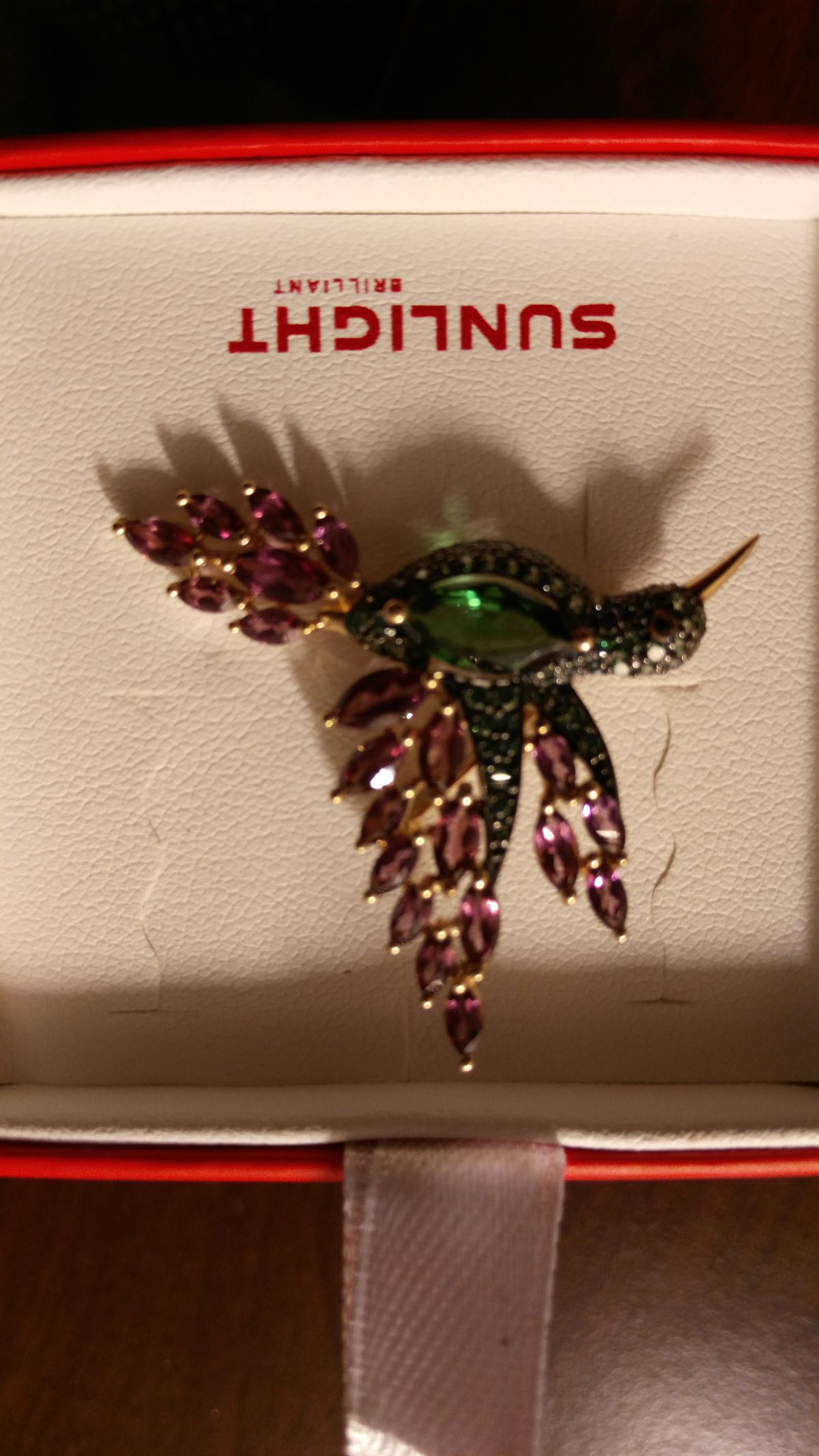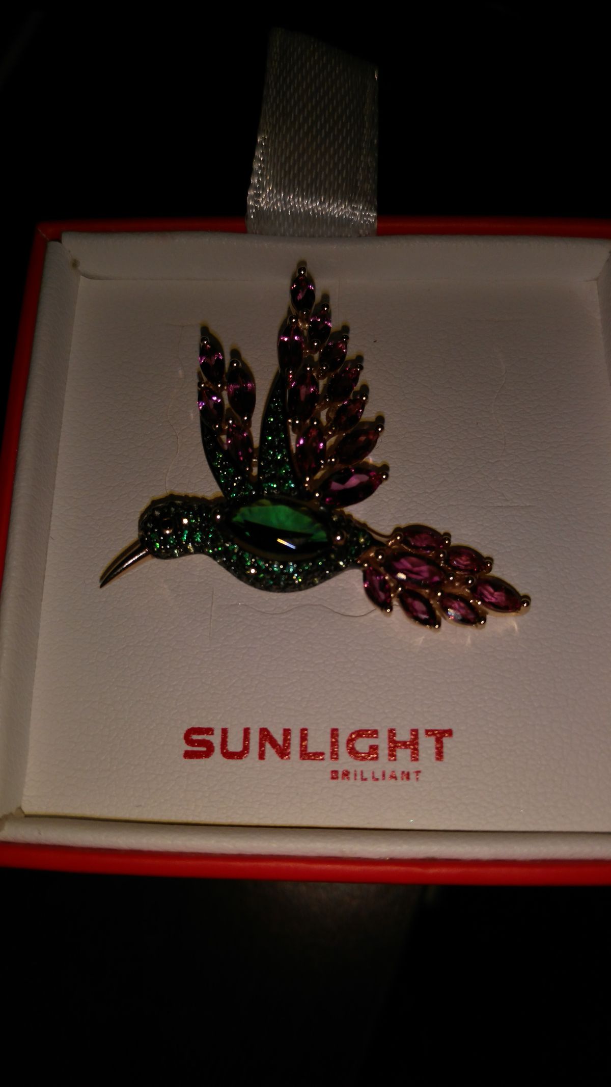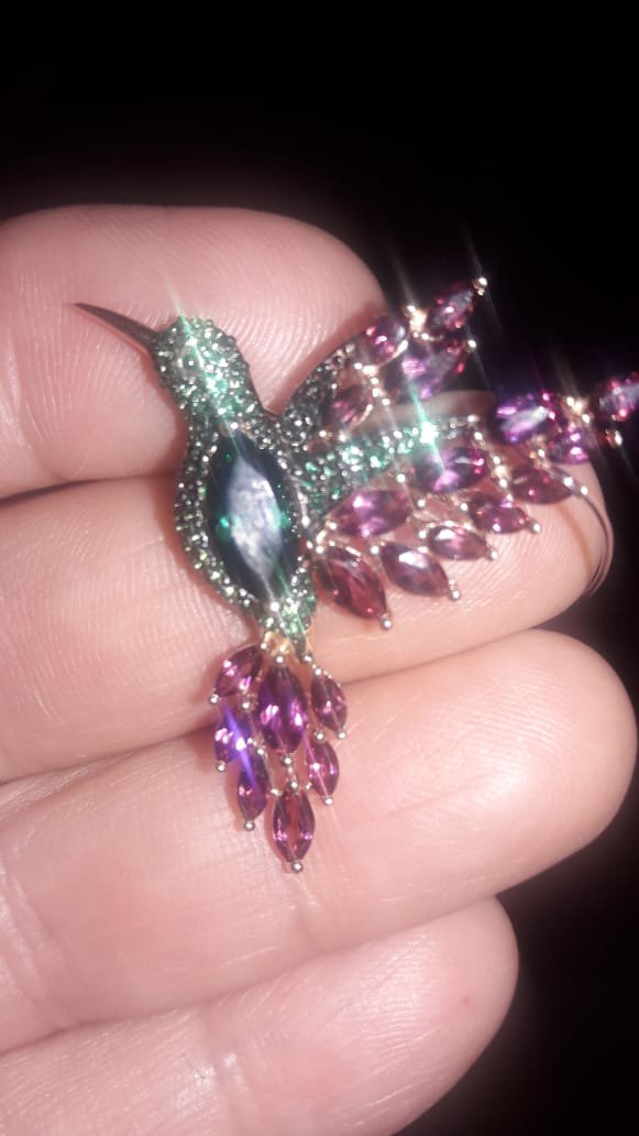 Очень красивая брошь-колибри. Яркая, привлекает внимание. Практически все украшения фирмы «Соколов», изящные и имеют свою изюминку. Спасибо «Санлайт», за отличную цену!