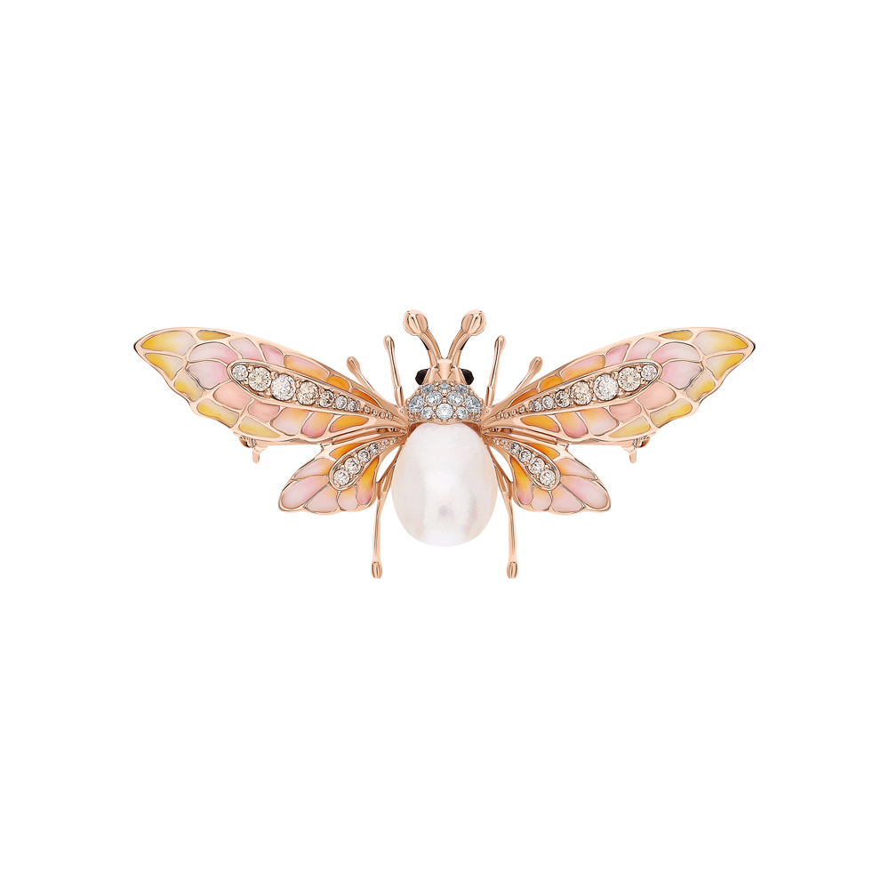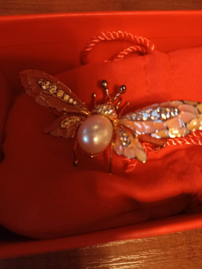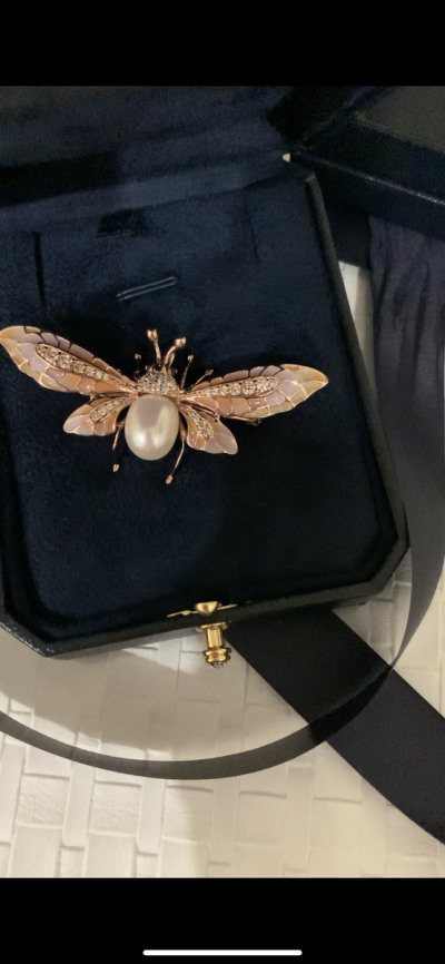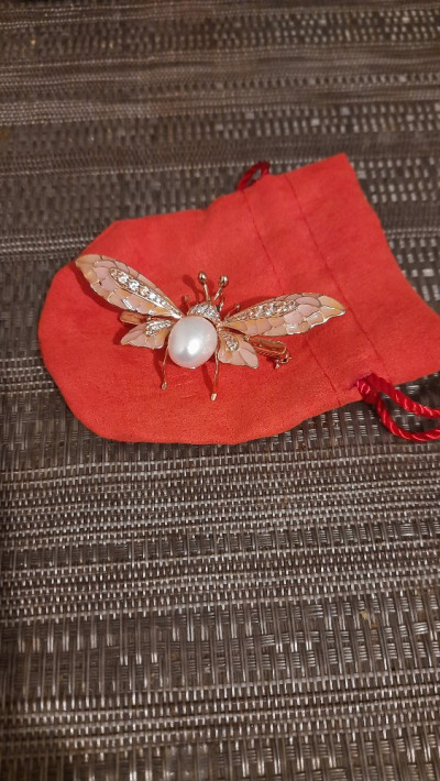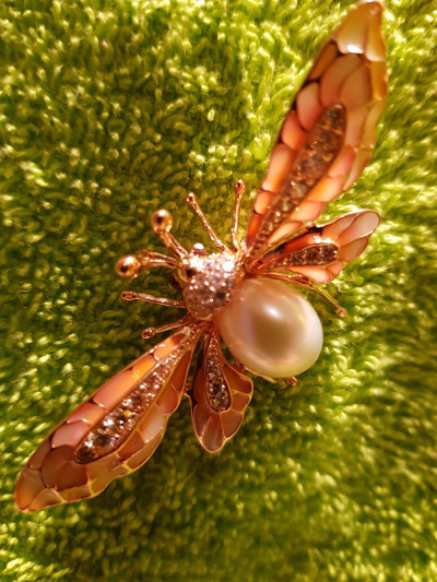Очень качественная работа ювелира, крылышки из прозрачной витражной эмали с нежнейшими переливами цвета украшены фианитами, что очень оживляет это произведение искусства.