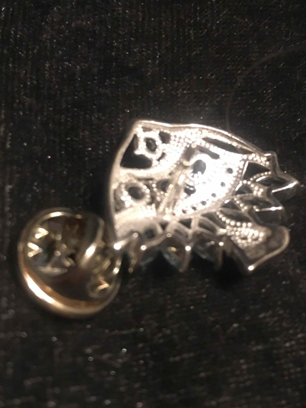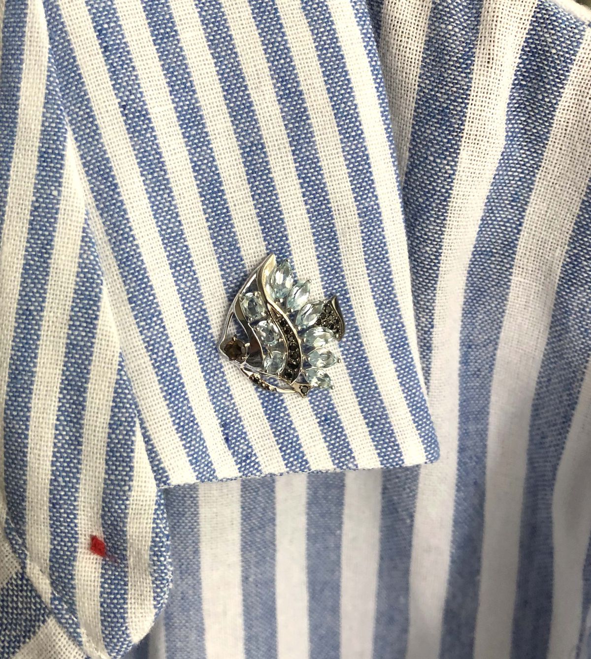 Небольшая брошь в виде рыбки. С топазами. Мне понравилась в качестве украшения на воротник рубашки. Ее размер как раз подходит для этого. Аккуратная. Переливается. Застежка, как у значка. Сидит крепко.