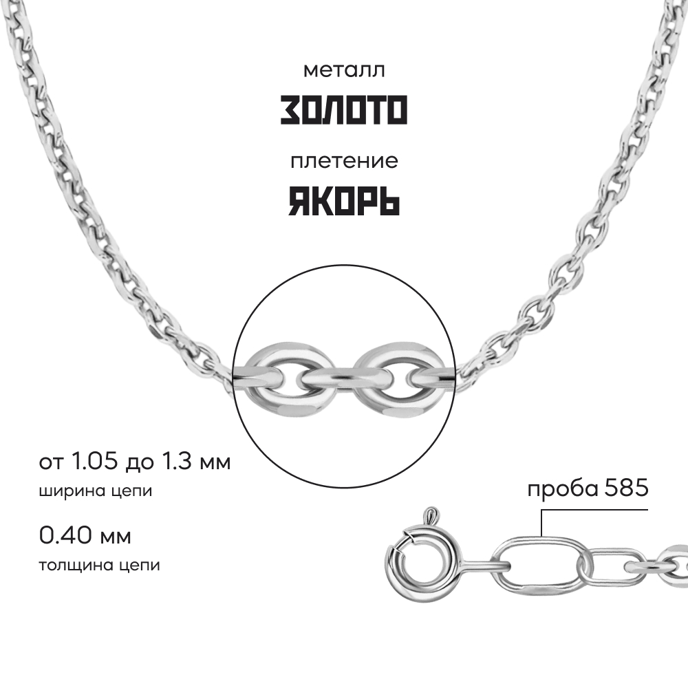 Якорное плетение - настолько надежное, что можно "вешать якорь". Звенья расположены под прямым углом друг к другу, от чего цепь получается объемной и крепкой. Плетение универсально, подходит и женщинам, и мужчинам. Классическая якорная цепь состоит из звеньев продолговатой формы с закругленными концами. Для усиления блеска края обрабатывают алмазной гранью.