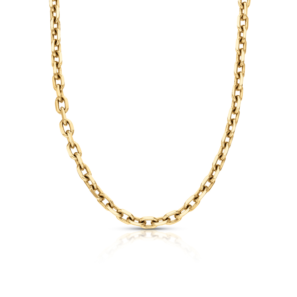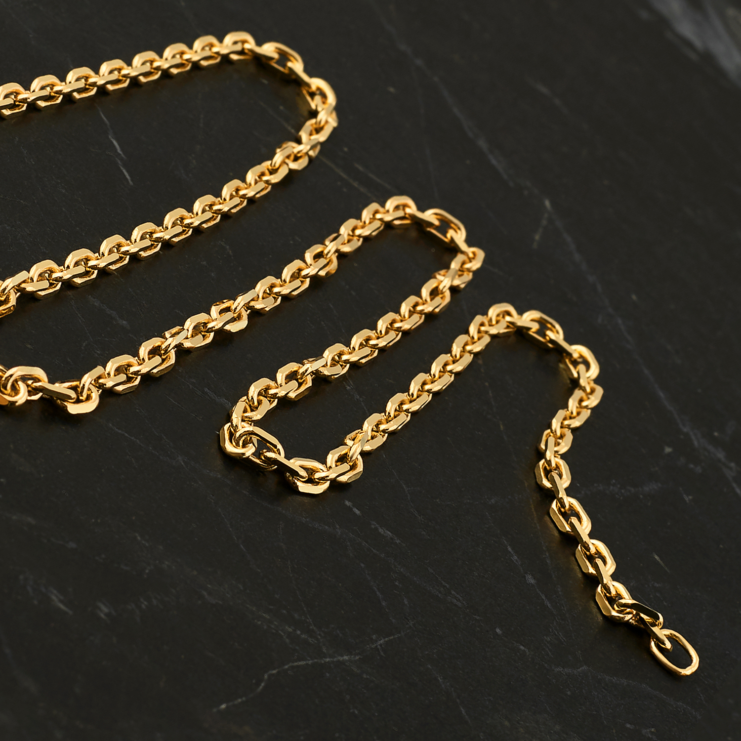 Якорное плетение - настолько надежное, что можно "вешать якорь". Звенья расположены под прямым углом друг к другу, от чего цепь получается объемной и крепкой. Плетение универсально, подходит и женщинам, и мужчинам. Классическая якорная цепь состоит из звеньев продолговатой формы с закругленными концами. Для усиления блеска края обрабатывают алмазной гранью.