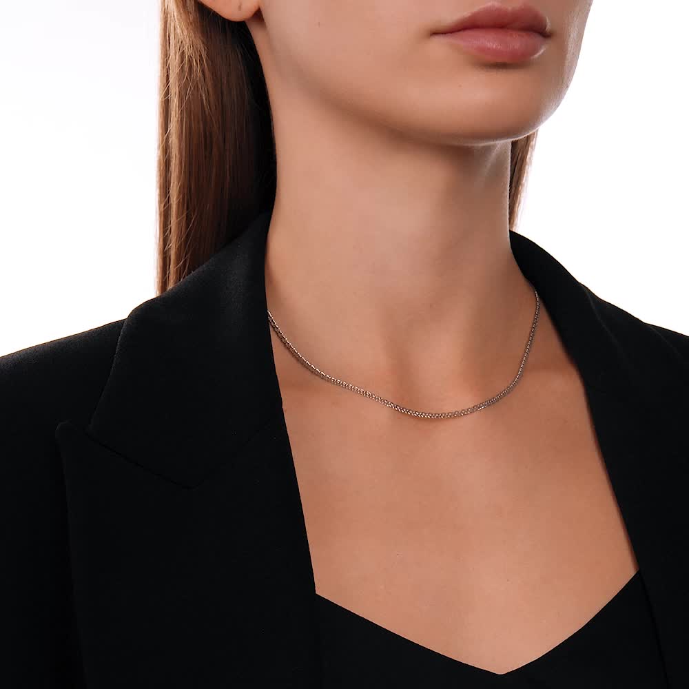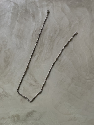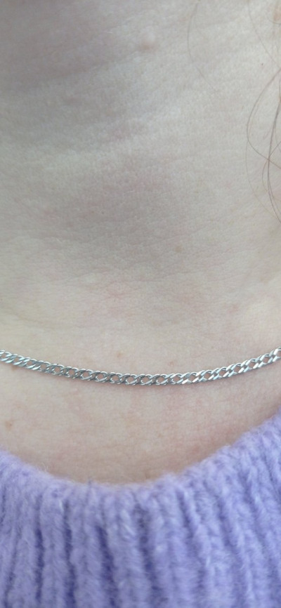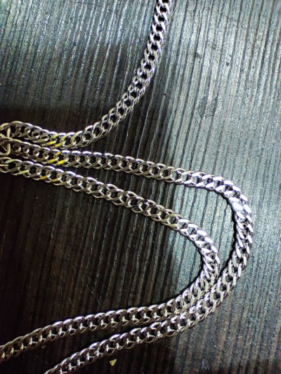Досталась по хорошей цене меньше за грамм, ну я очень довольна. В отличие от браслета в районе замка меньше лишних тонких колец, показалось, что так надежнее, не порвутся. На шее не ощущаю, вес около 3.5 граммов.