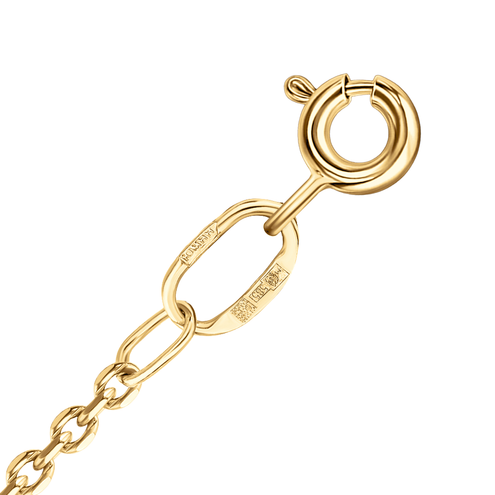 Якорное плетение - настолько надежное, что можно "вешать якорь". Звенья расположены под прямым углом друг к другу, от чего цепь получается объемной и крепкой. Плетение универсально, подходит и женщинам, и мужчинам. Классическая якорная цепь состоит из звеньев продолговатой формы с закругленными концами. Для усиления блеска края обрабатывают алмазной гранью.