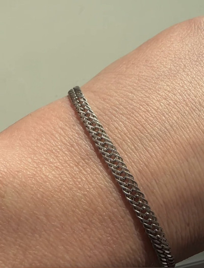Покупала мужу, доволен. Носим не снимая, не темнеет. По размеру подошла, смотрится красиво ,за счет такого плетения шикарно.