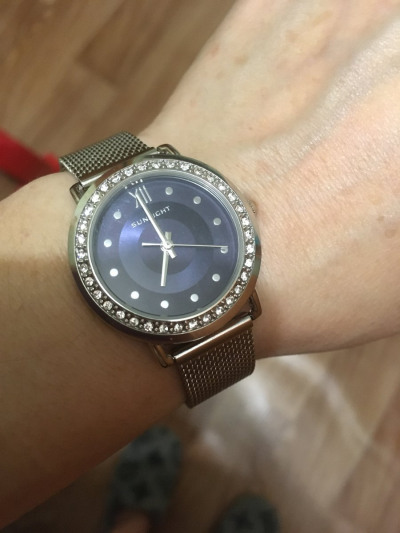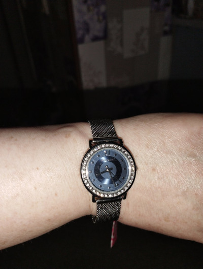 Очень нравится эти часы. Не смотря на то, что наручных часов у меня много, я купила их потому, что понравился цвет и оформление циферблата. Фианиты по кругу блестят, играют. Батарейку ещё не меняла, хотя купила часы полтора года назад.