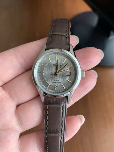 В описании неточность: производство Испания! Стекло сапфировое, что огромный плюс! Диаметр 29 мм( я намерила чуть меньше), так что на крупной реку могут немного теряться! Очень понравилась сочетание серебряного циферблата, золотых стрелок и меток!!! Ремешок кожаный, но дубовый. В SL оказались дешевле всех магазинов и сайтов!!! Я очень довольна!