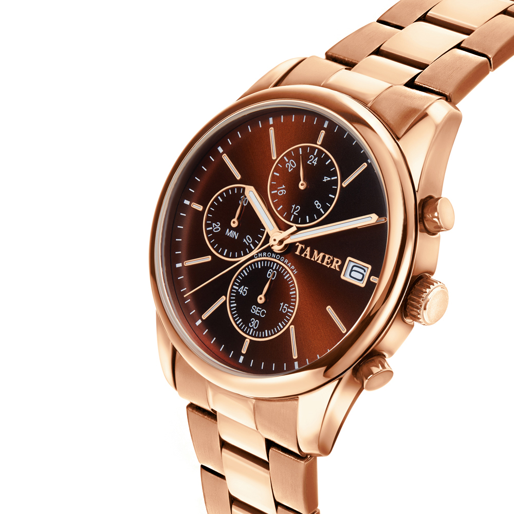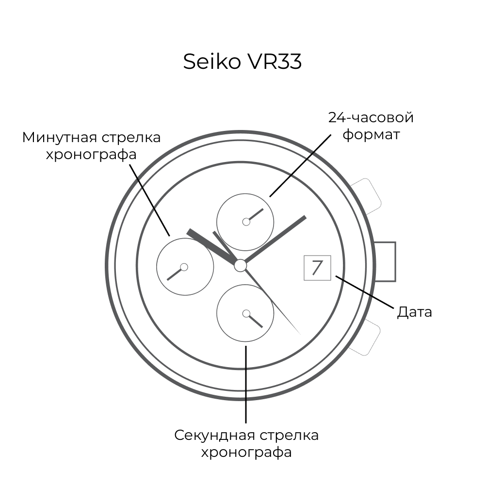 Корпус выполнен из металла*, минеральное стекло с антибликом защищает циферблат от внешнего воздействия. Японский кварцевый механизм SEIKO VR33 обеспечивает точный ход и оснащен функциями времени в 12/24 часовом формате, секундной стрелки, даты и хронографа. Водозащита 5 bar (50 m/165 ft) защитит от брызг и дождя.