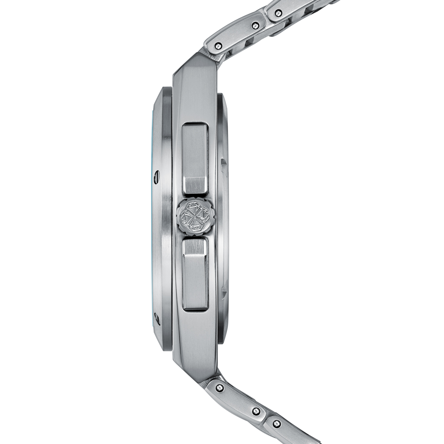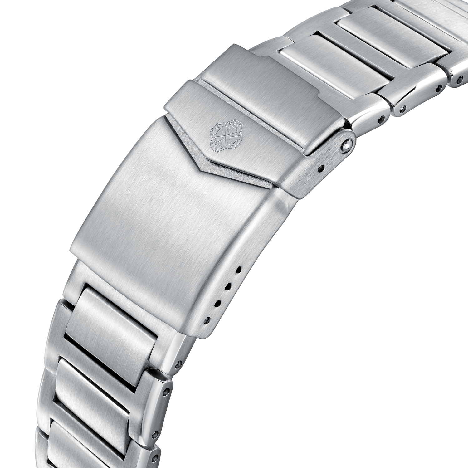 Корпус выполнен из титана. Он легче и прочнее стали. Сапфировое стекло с антибликом защищает циферблат от внешнего воздействия. Надежный швейцарский кварцевый механизм Ronda 3540 оснащен функциями времени в 12 часовом формате, секундной стрелкой, датой и хронографом. Водозащита 10 bar (100 m/330 ft)* позволяет плавать в часах.