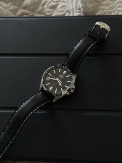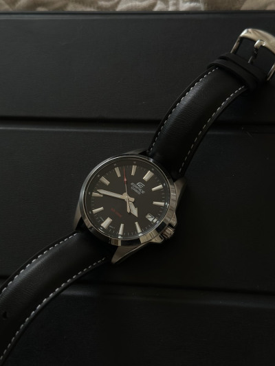 Лаконичная и аккуратная модель из серии EFV-100 в стальном корпусе на ремешке из натуральной кожи. Пожалуй, это одни из самых спокойных и минималистичных часов Edifice на сегодня. Белый циферблат защищен прочным минеральным стеклом, а водозащита позволяет пользоваться часами в любых погодных условиях.