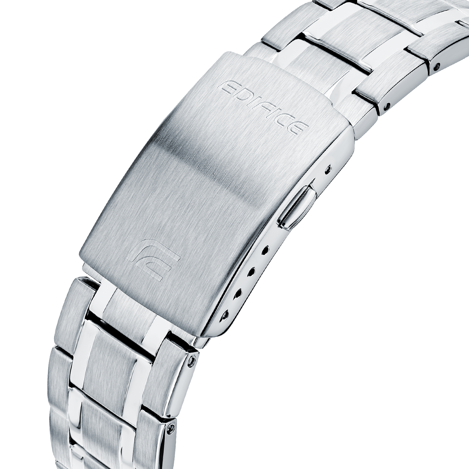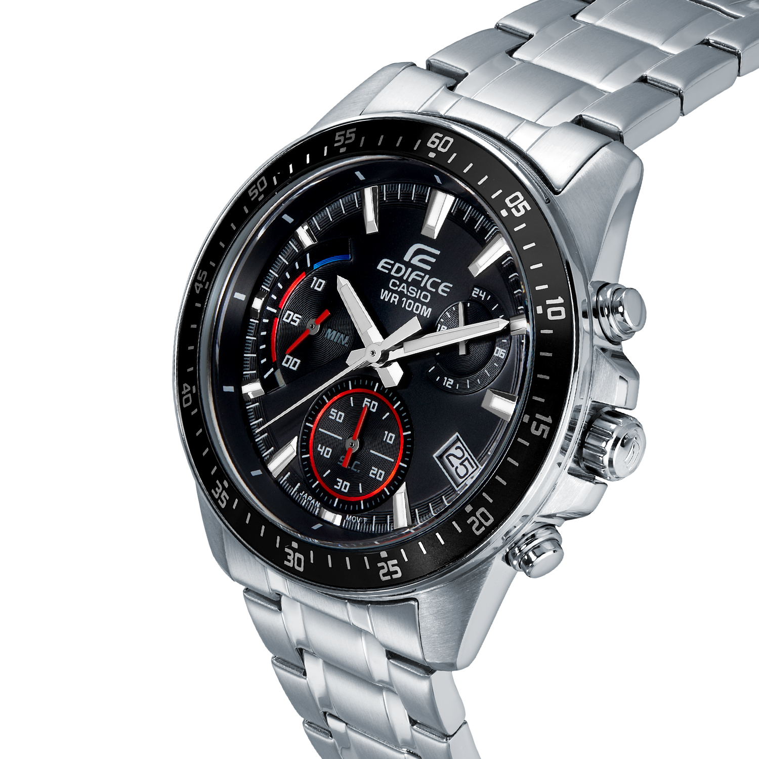 Суперстильный хронограф из серии EDIFICE в стальном корпусе с черным безелем и циферблатом. Модель отличает простой и лаконичный дизайн со спортивным нравом. Циферблат защищен прочным минеральным стеклом, а водозащита позволяет пользоваться часами в любых погодных условиях. Десяти минутный секундомер отображает показатели с помощью двойной индикации: секунды на 6-ти часовой отметке и ретроградный десяти минутный счетчик на 9-ти часовой. Крепкие и спокойные эдифайсы на каждый день, без лишней агрессии и вычурности.
