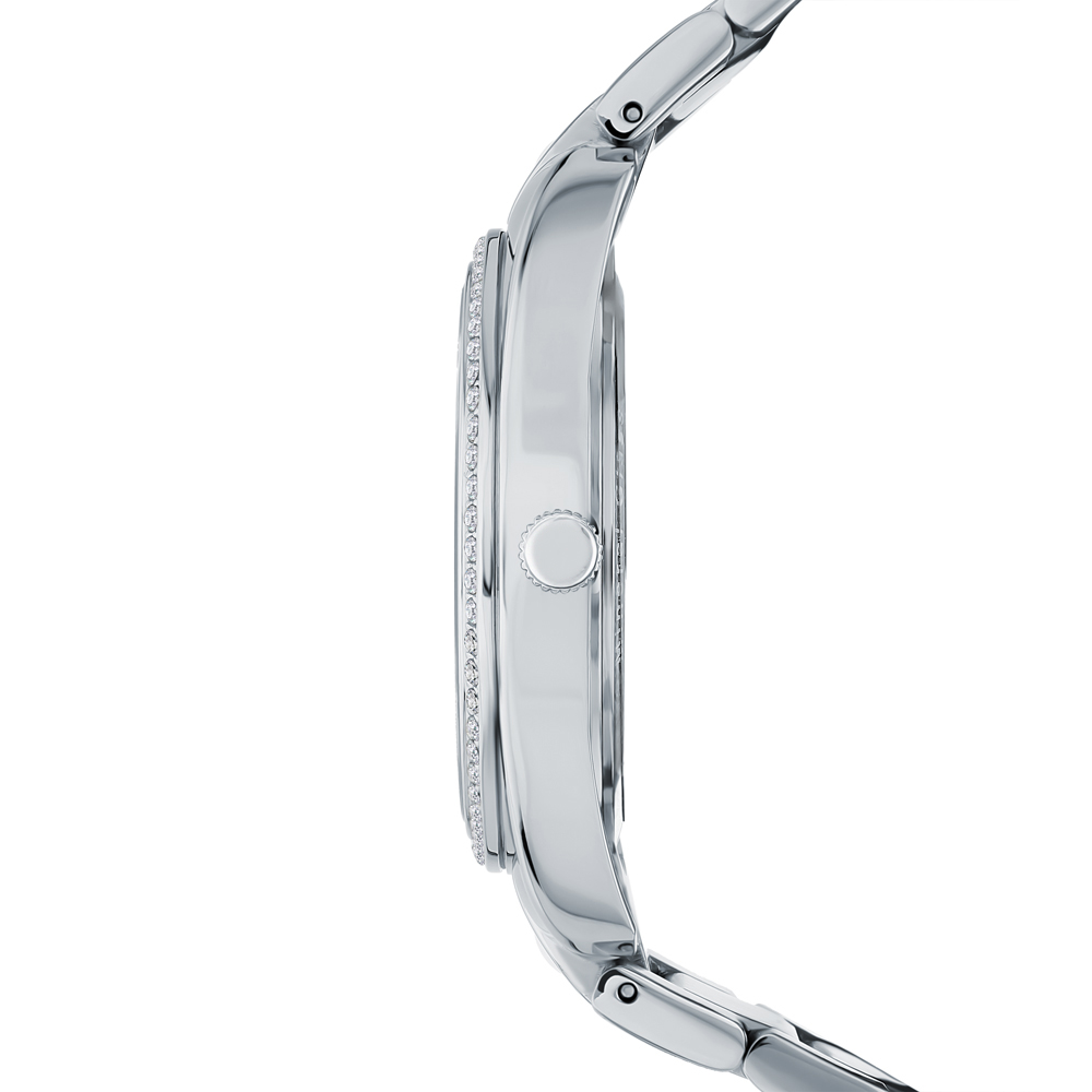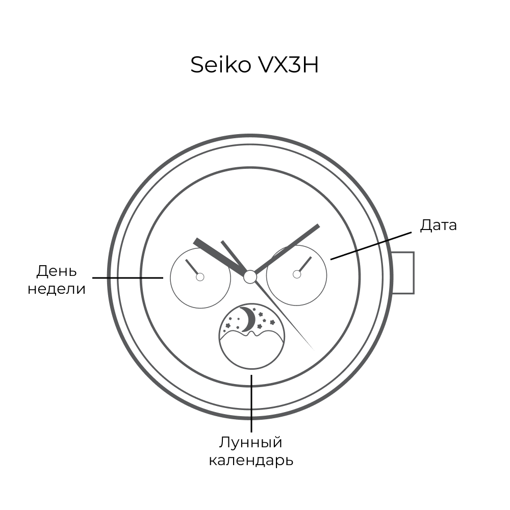 Корпус выполнен из стали 316L, минеральное стекло защищает циферблат от внешнего воздействия. Японский кварцевый механизм Seiko VX3H обеспечивает точность и оснащен функциями времени в 12 часовом формате, секундной стрелкой, датой, днем недели и лунным календарем. Водозащита 5 bar (50 m/165 ft)* позволяет мыть руки в часах, а так же защитит от брызг и дождя.