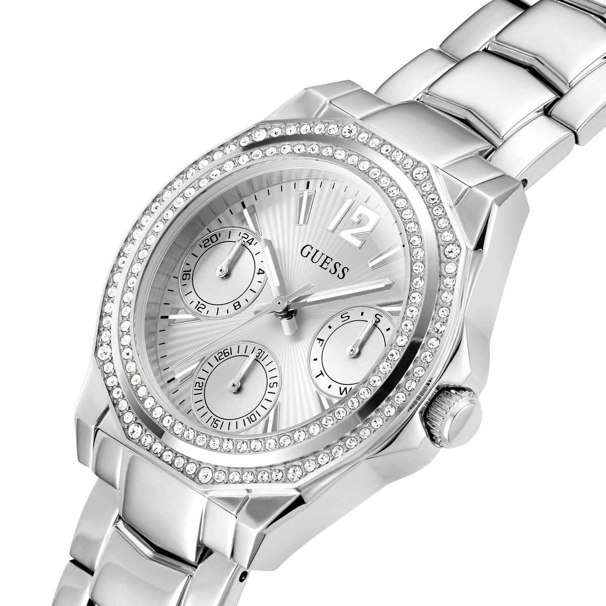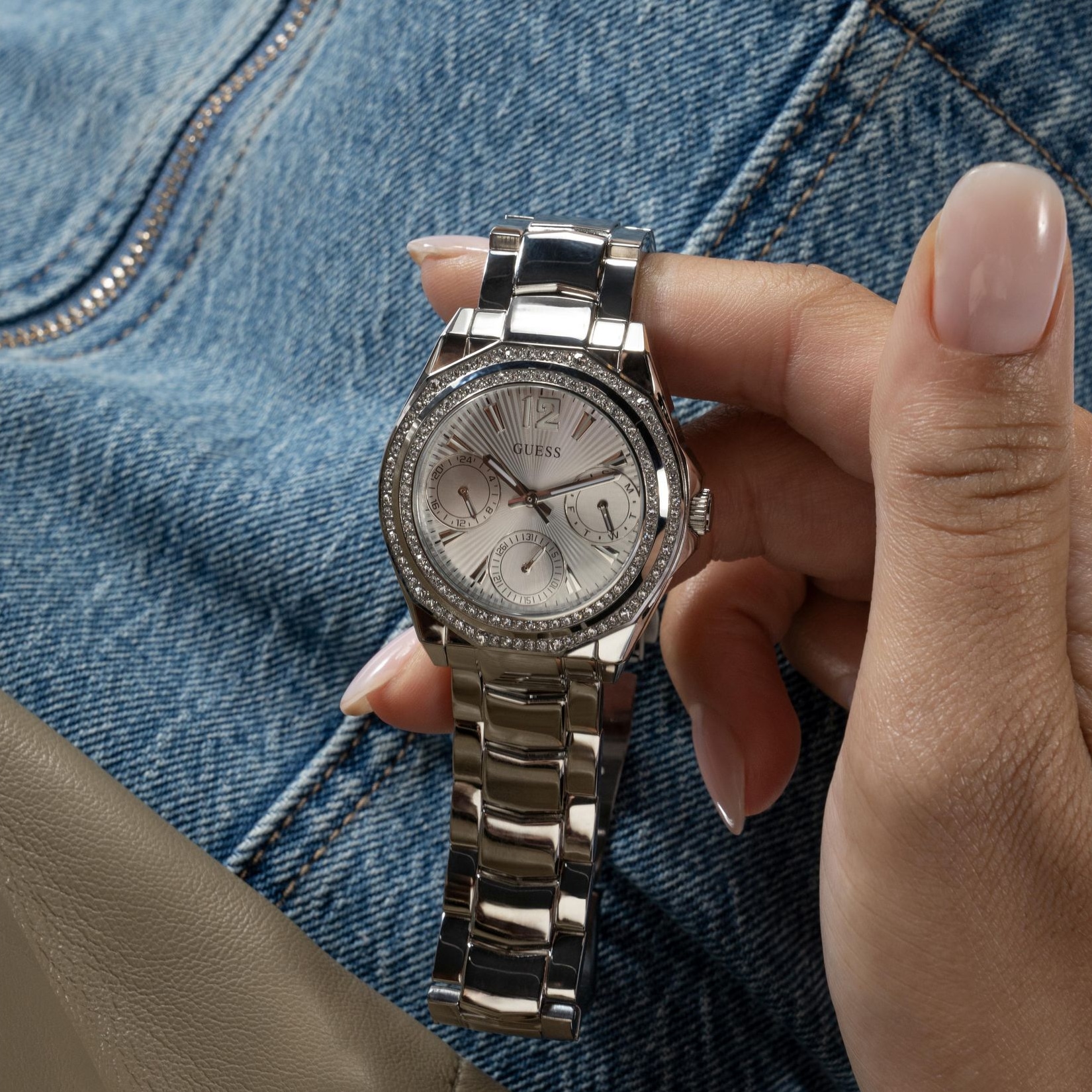 Женские наручные часы GUESS модель GW0685L1 из коллекции GUESS DRESS. Японский кварцевый мультифункциональный механизм VX7JE1 SEIKO (TMI) с вынесенными на отдельные циферблаты датой, днем недели и часовой стрелкой в режиме 24 часа использующий элемент питания SR927SW. Стальной корпус размера 36 мм. Минеральное стекло. Стальной браслет. Водостойкость 5 АТМ (мытье рук, дождь). GUESS – лидер в индустрии фешен часов по длительности присутствия на рынке и по ширине коллекции, ежегодно создает более 100 новинок. Компания GUESS Watches, основанная в 1984 году в Лос-Анджелесе (США) как пионер революции, возглавила трансформацию часов из простого инструмента для определения времени в стильный аксессуар. Бренд не боится экспериментировать. Разнообразные формы корпуса, сложно декорированные циферблаты, уникальный дизайн браслетов. GUESS – это про тренды и технологии в мире моды. Это яркие и дизайнерские часы, призванные угодить самым смелым фешн-драйверам и энтузиастам моды по всему миру. Страна-изготовитель: Филиппины. При изготовлении используются только надежные Японские механизмы. ВНИМАНИЕ! Заявленная водостойкость гарантируется только при плотно закрытой или закрученной заводной головке!