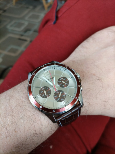 Очень красивые недорогие оригинальные "Касио". Настройка несложная, интуитивно понятная: вращая головку, выставляете время и время суток на маленьком самом левом циферблатике, верхней кнопкой под острый предмет день недели(циферблатик справа) нижней-число. С днём недели есть странная особенность: меняется на новый не в полночь(как было бы логично), а в третьем часу, примерно в 2:15. При этом новое число настаёт ожидаемо в полночь.