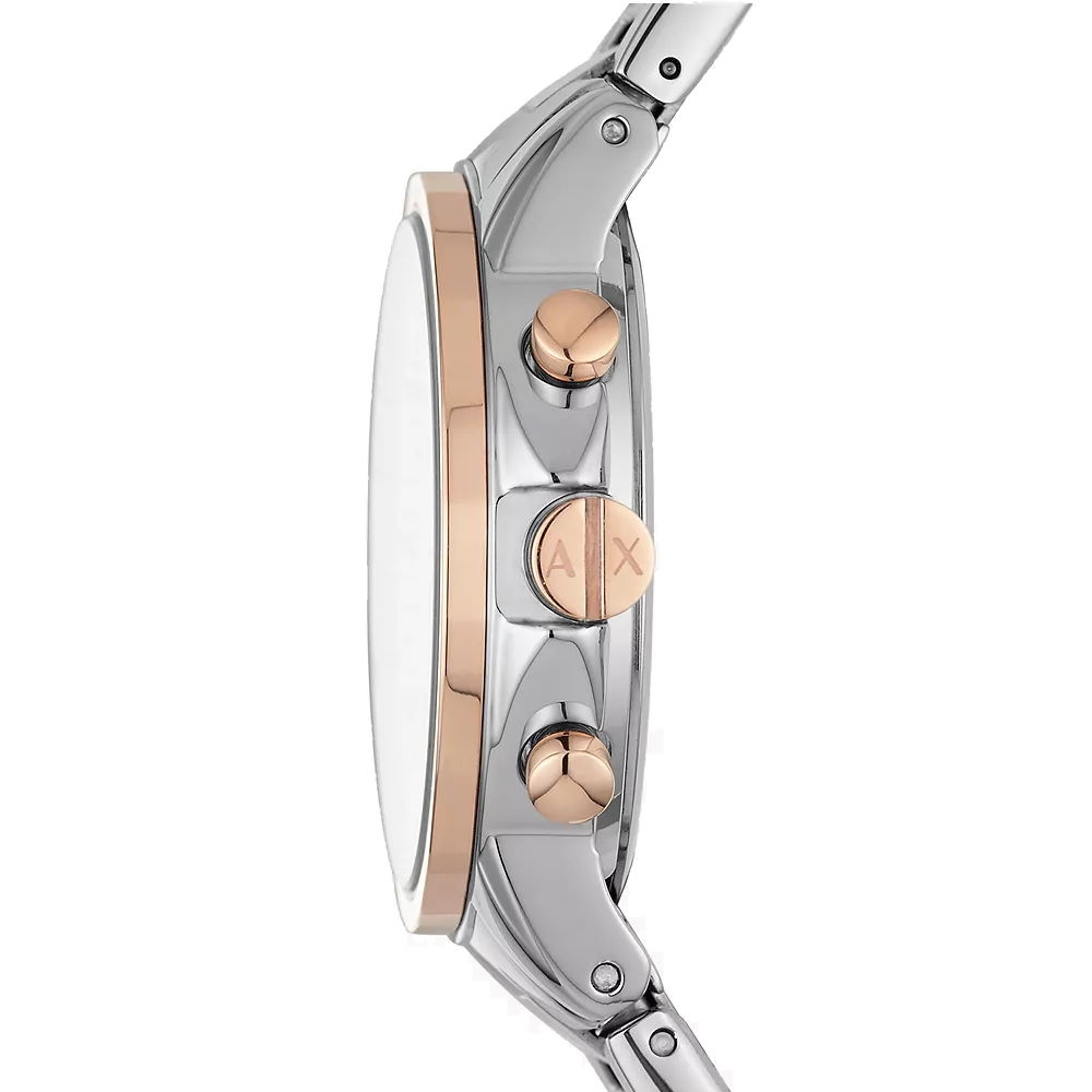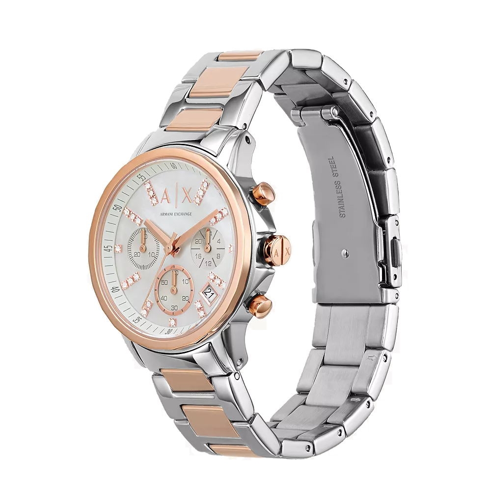 Наручные кварцевые женщинам часы марки ARMANI EXCHANGE артикул AX4331. Стальной корпус размера 36 мм и толщиной 10 мм. Кроме стандартных в модели добавлена функция секундомера (хронограф) и часовая стрелка в режиме 24 часа. Минеральное стекло. Стальной браслет. Водостойкость 5 АТМ (мытье рук, дождь). История всемирно известной компании Giorgio Armani берет свое начало в 1975 году в Милане, когда Джорджио Армани и Серджио Галеотти создали свое предприятие. Спустя пару десятков лет непрерывной деятельности компания была признана одной из лидирующих компаний в мировой моде. В 1991 именитый дизайнер создает бренд Armani Exchange, продукция которого предназначена для городских жителей, не желающих отставать от модных тенденций современности. ВНИМАНИЕ! Заявленная водостойкость гарантируется только при плотно закрытой или закрученной заводной головке!