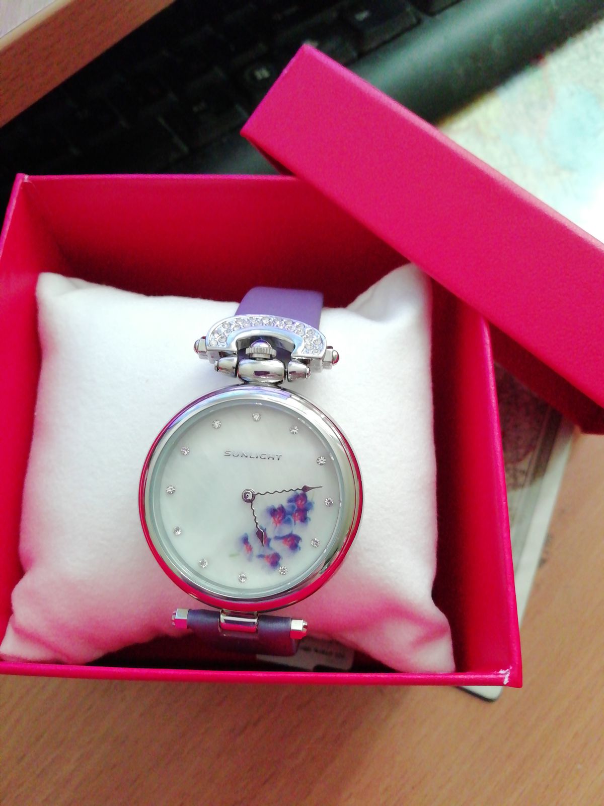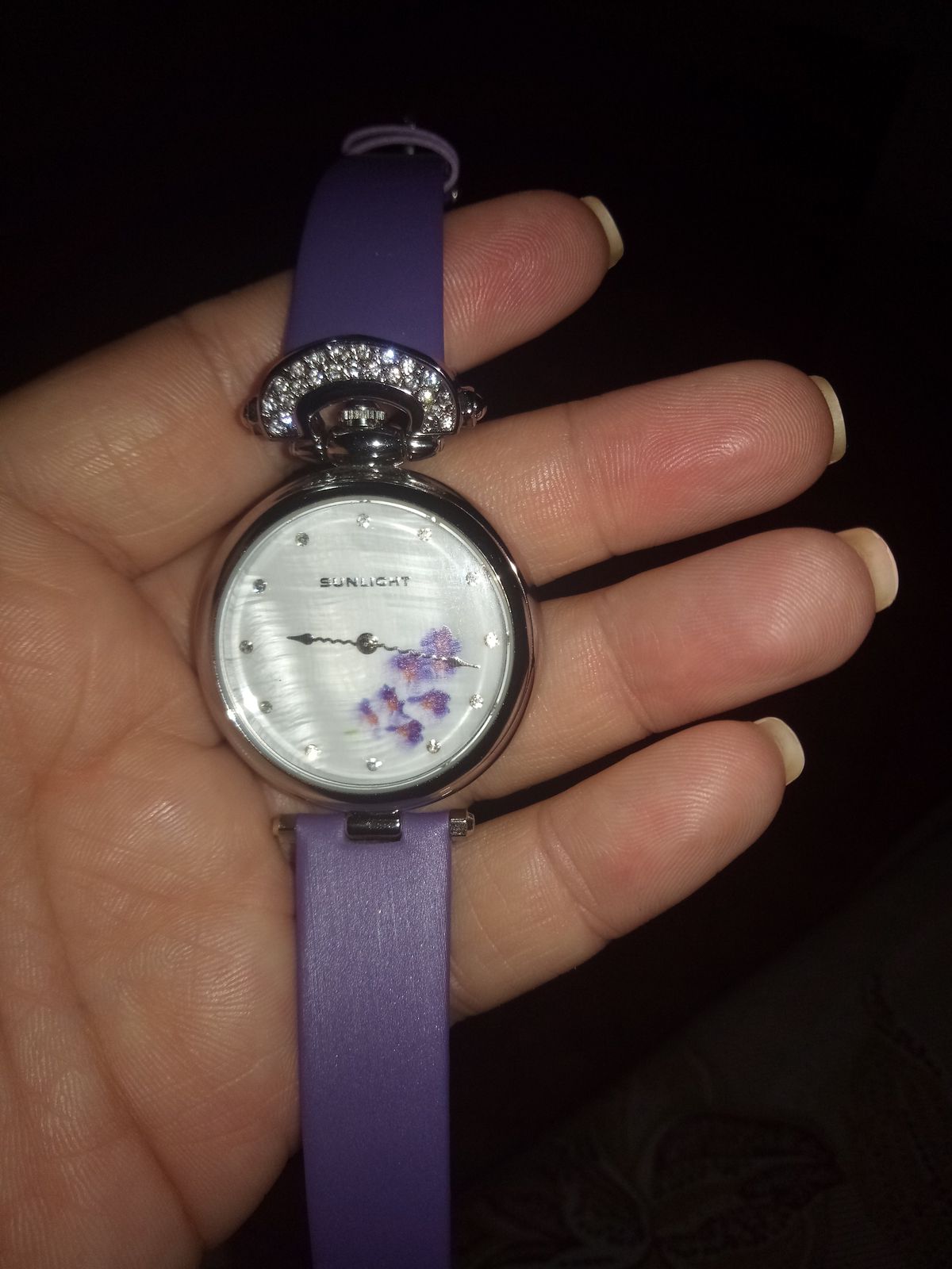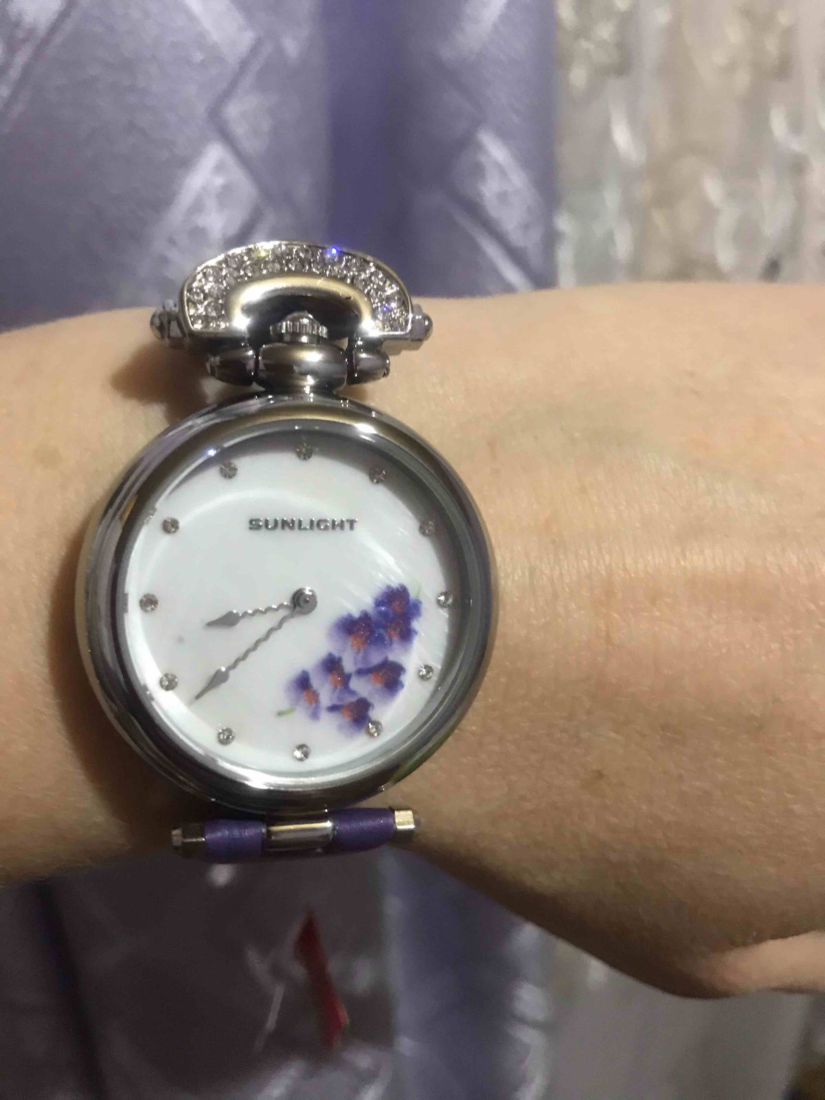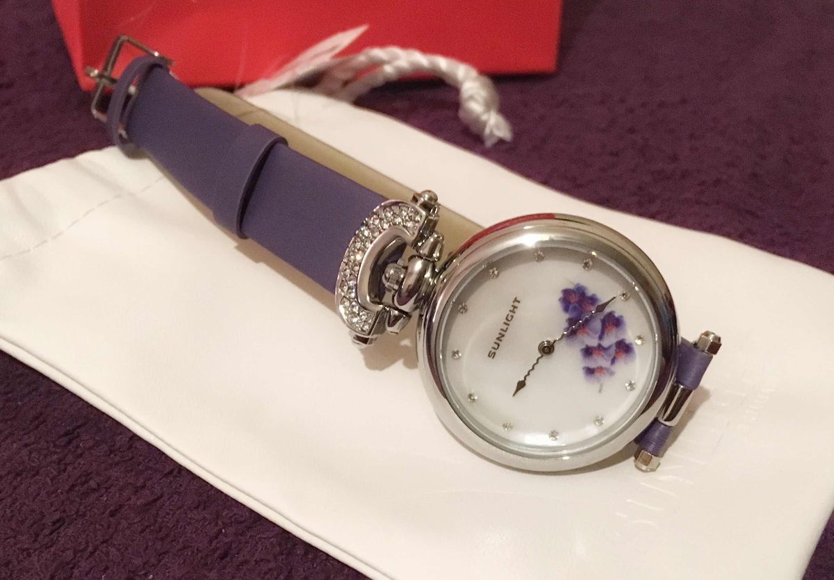 Наконец- то они мои!! Фиолетовые орхидеи, моя мечта! Мерла их ранее, показались громоздкими...ушла, не купив. Но думать о них не переставала ! Сейчас смотрю, все отлично, идеально сидят на руке, хороший циферблат! Веточка орхидеи, не избитый фиолетовый цвет ремешка,и необычная его форма приковывает взгляды! Волнообразная стрелка!👍😁 Модно, стильно! Спасибо санлайт, рекомендую однозначно!👍👍👍