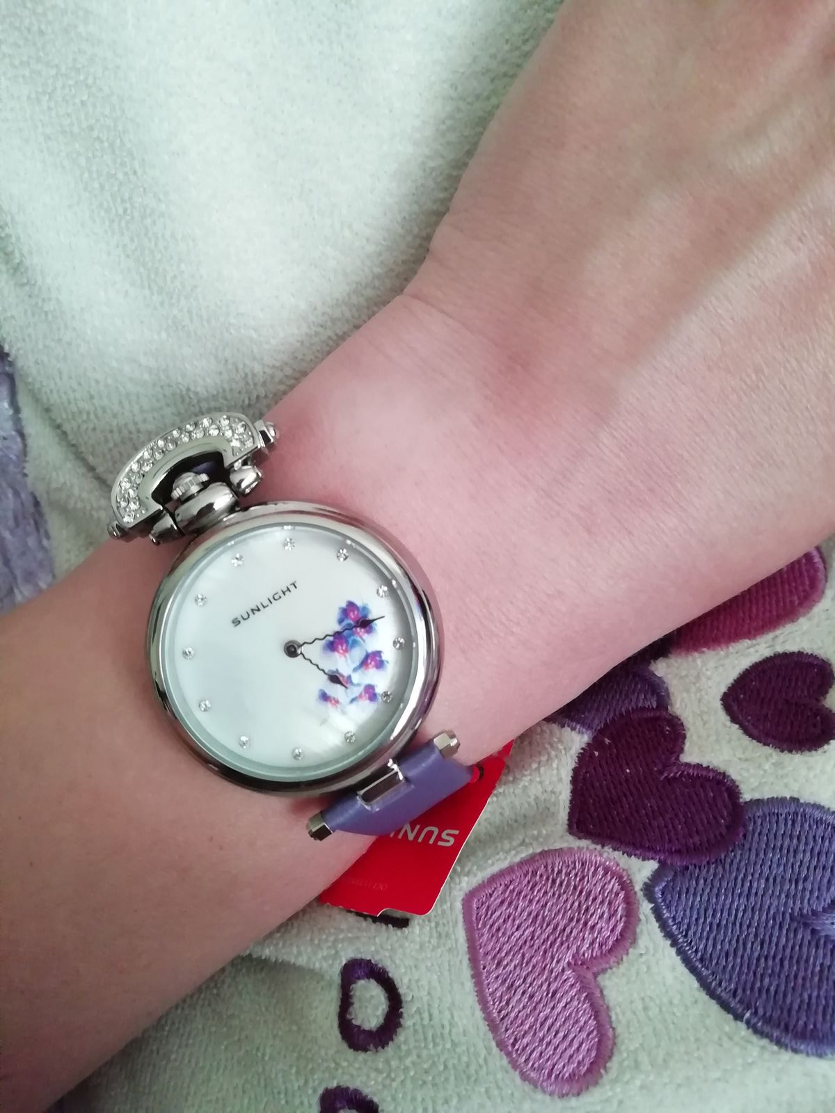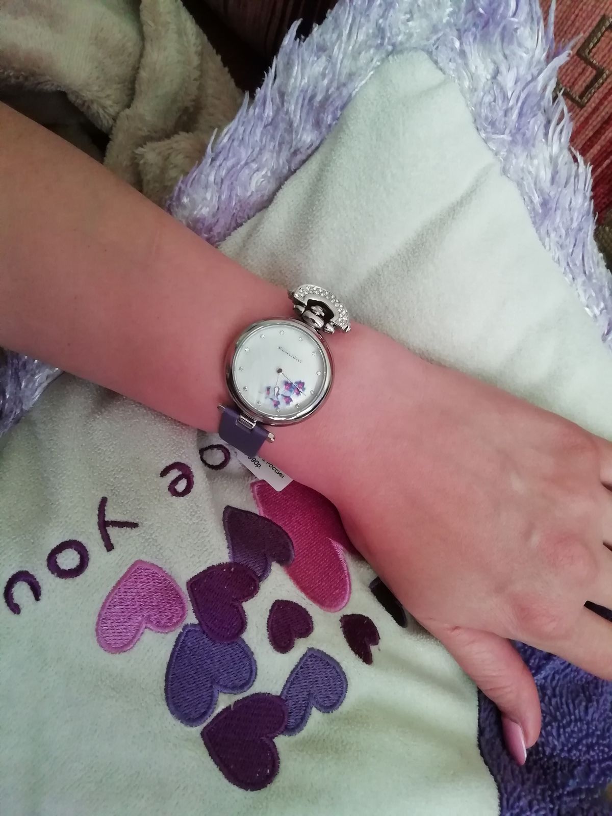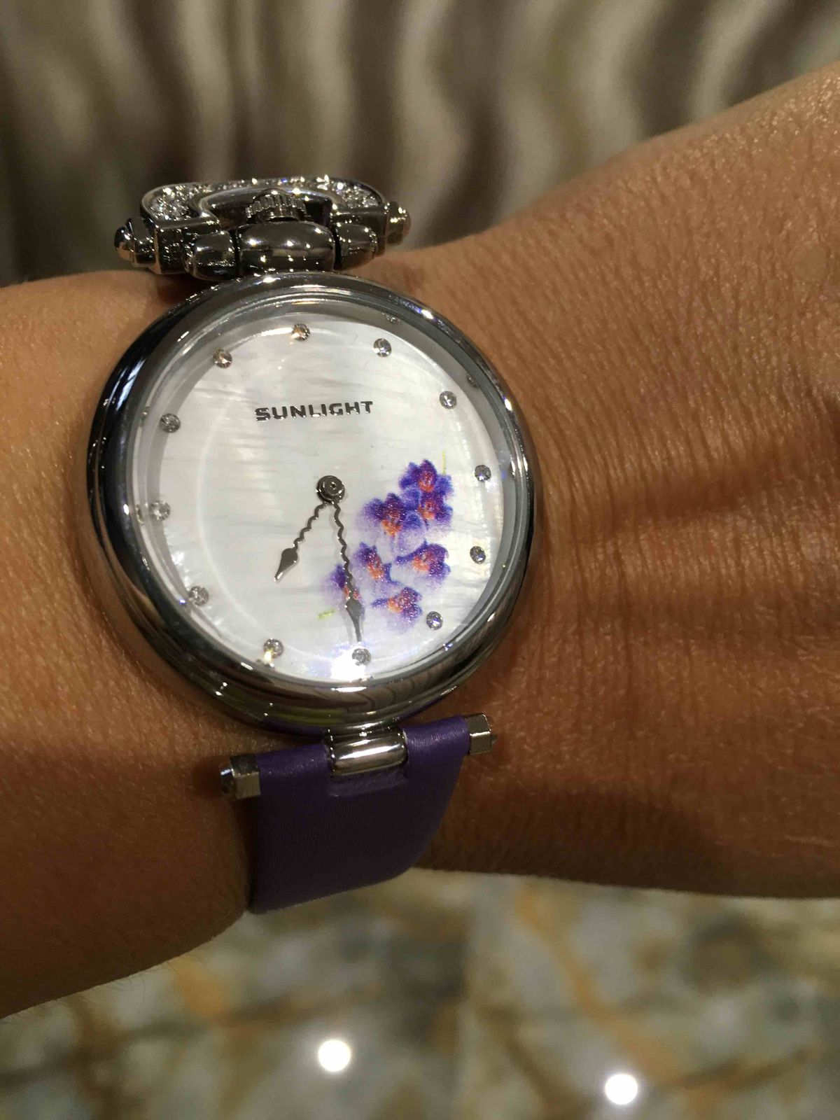 Наконец- то они мои!! Фиолетовые орхидеи, моя мечта! Мерла их ранее, показались громоздкими...ушла, не купив. Но думать о них не переставала ! Сейчас смотрю, все отлично, идеально сидят на руке, хороший циферблат! Веточка орхидеи, не избитый фиолетовый цвет ремешка,и необычная его форма приковывает взгляды! Волнообразная стрелка!👍😁 Модно, стильно! Спасибо санлайт, рекомендую однозначно!👍👍👍