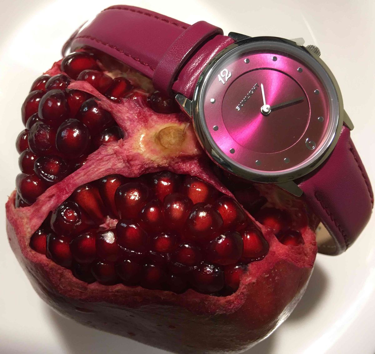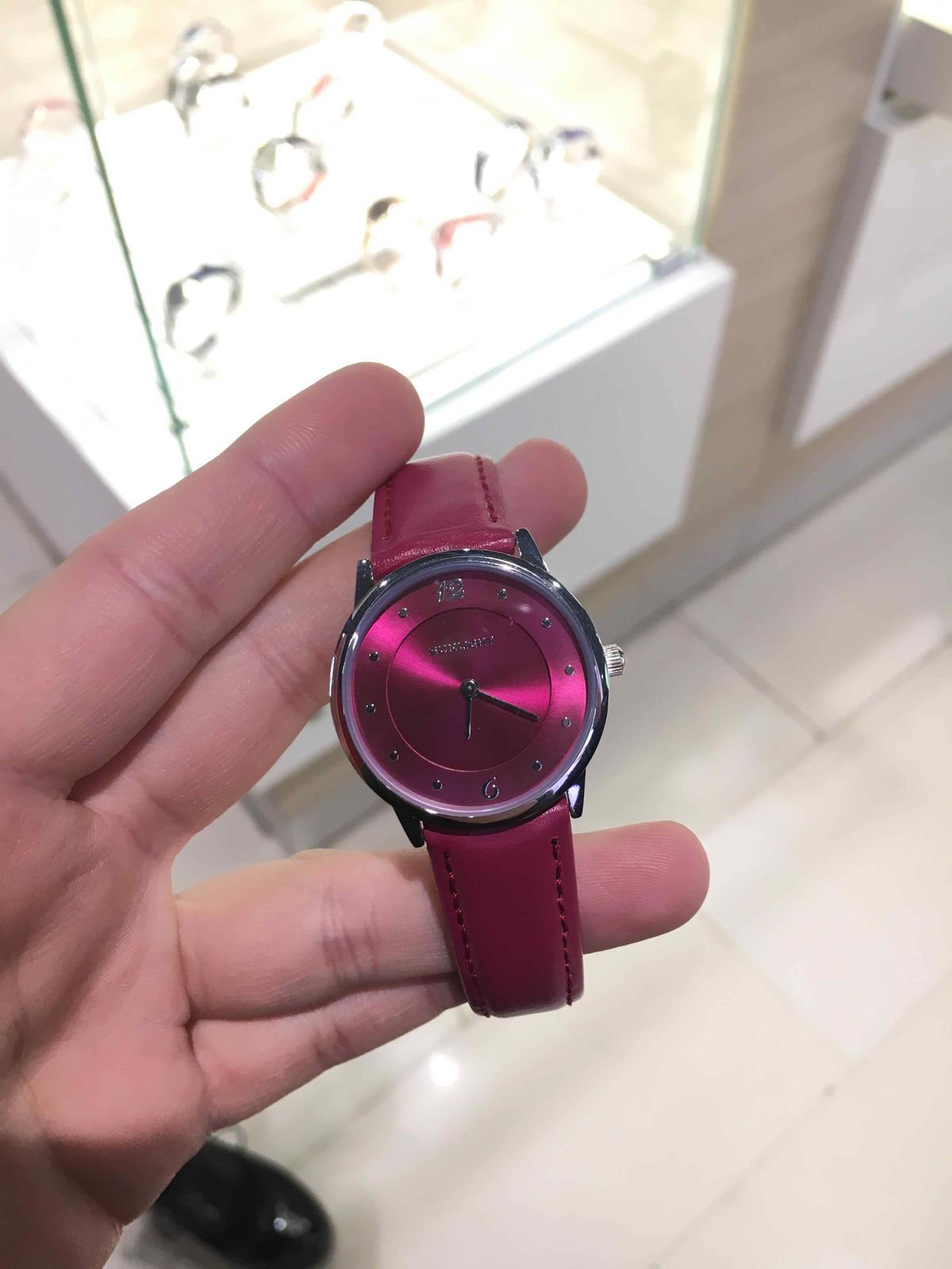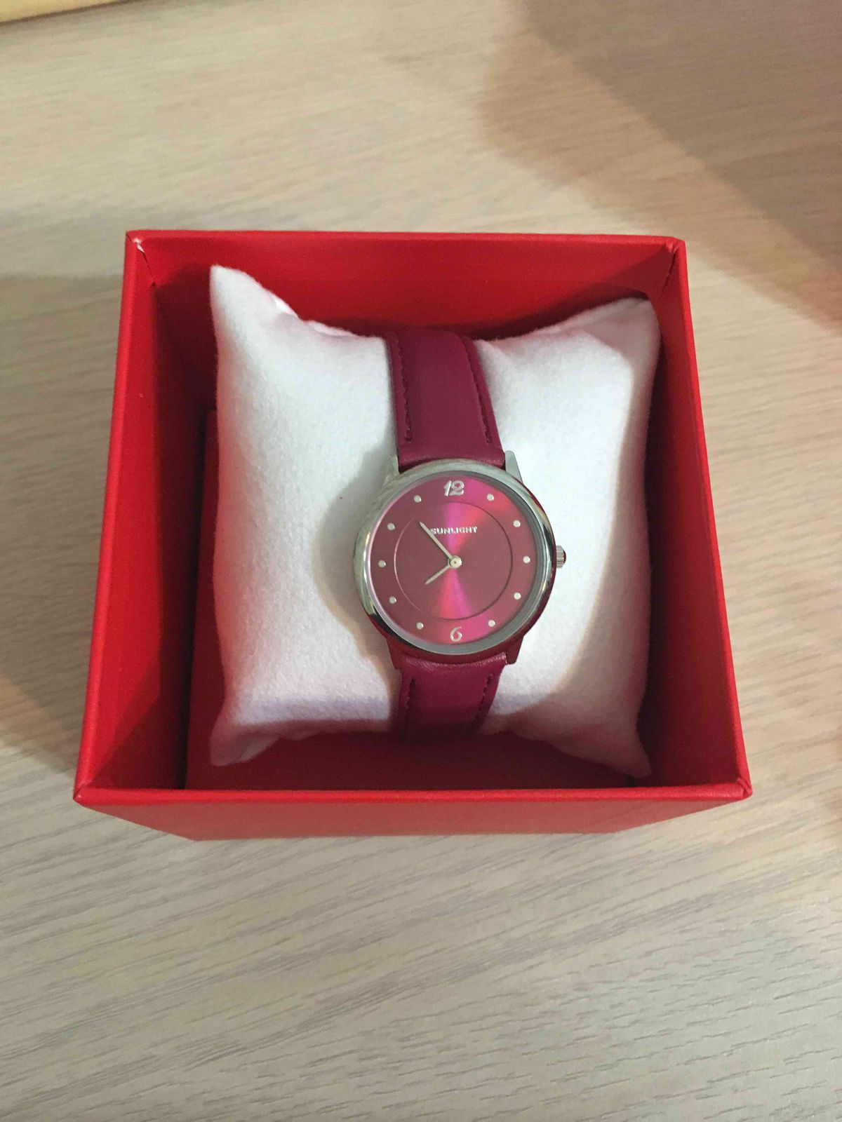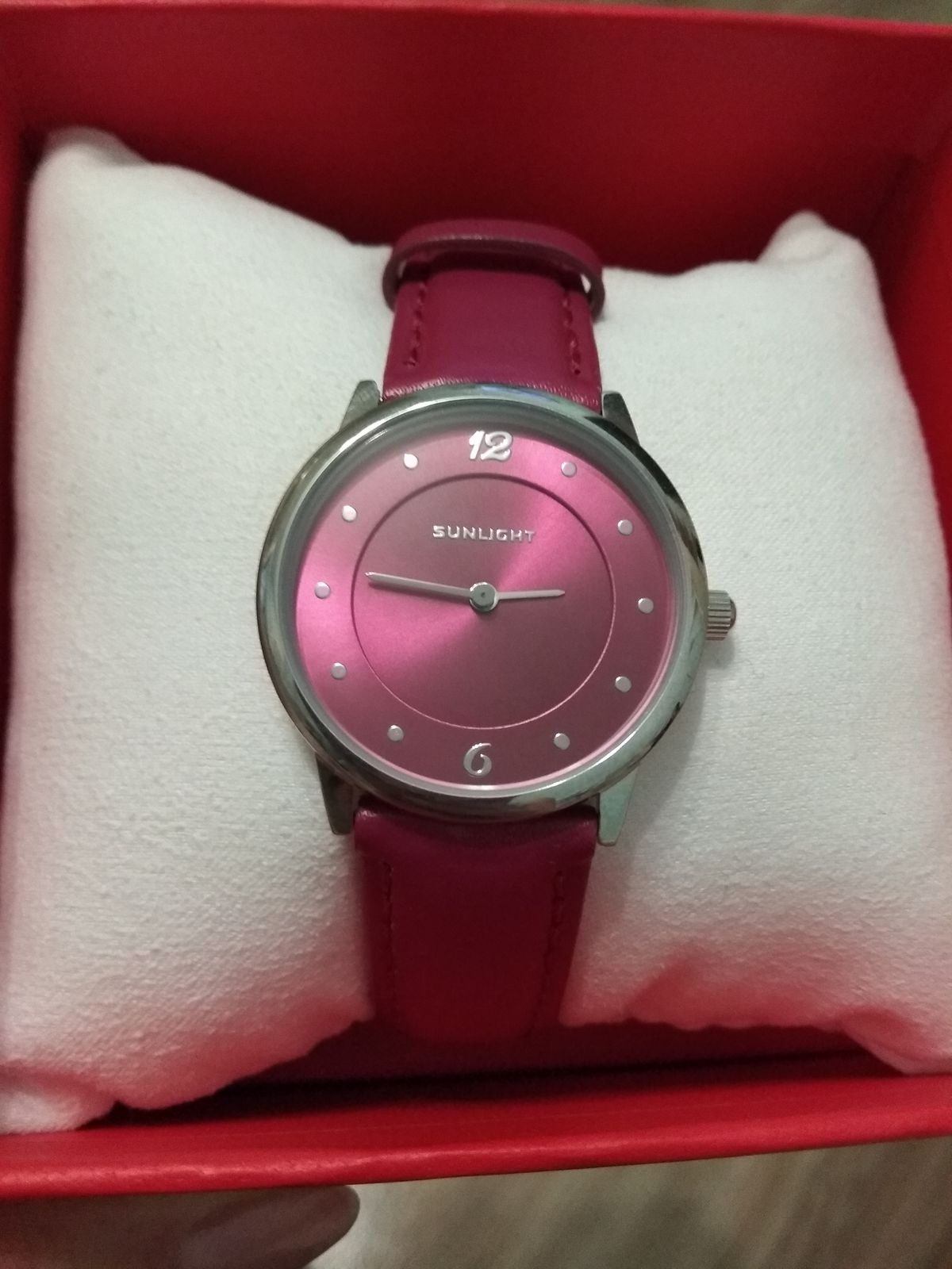 Потрясающий вишнёвый цвет, мягкий ремешок, идеально облегающий запястье, яркий циферблат и хорошо заметные стрелки - секрет идеальных часов!