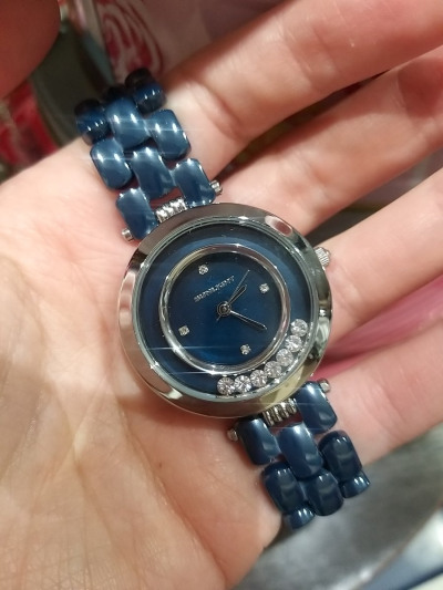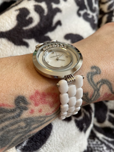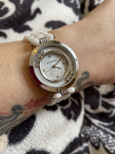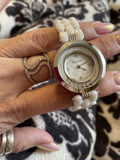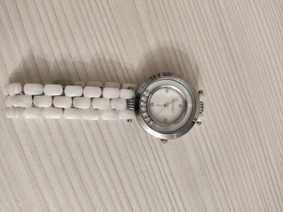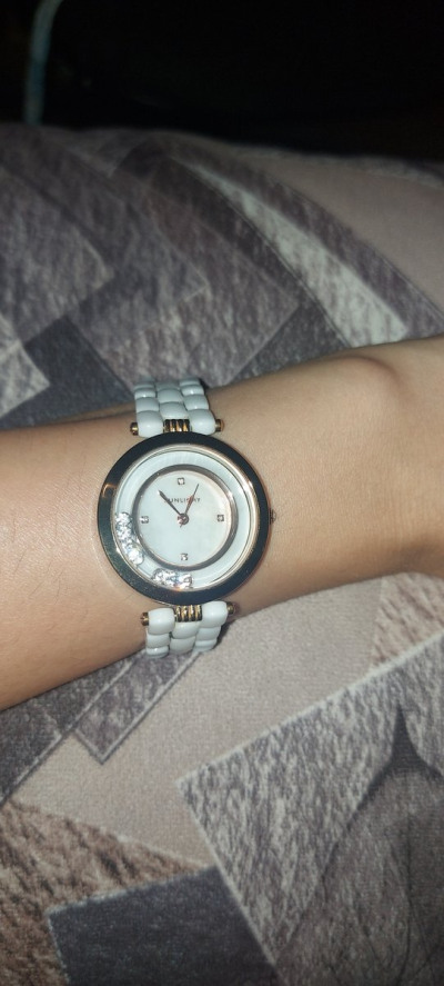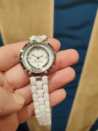 Керамический браслет, уменьшила на пару звеньев, белые часы смотрятся красиво, камушки вокруг циферблата бегают по кругу, основные 4 цифры обозначены стразами, женственный, нежные, шикарные часы