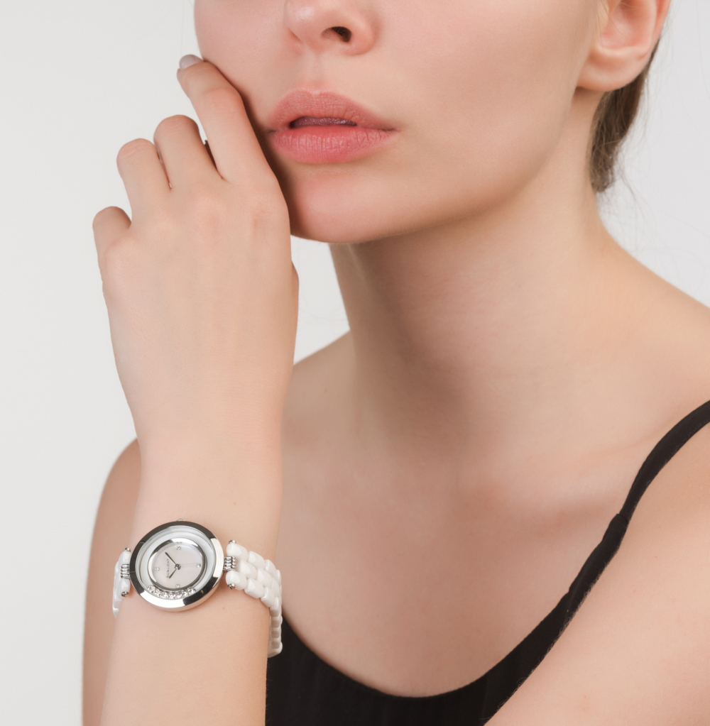 За счет белой керамики выглядят очень нежно. Циферблат оформлен бегающими камушками, что придает игривости. Ремешок длинноват, укоротили у часовщика. Рада покупки.