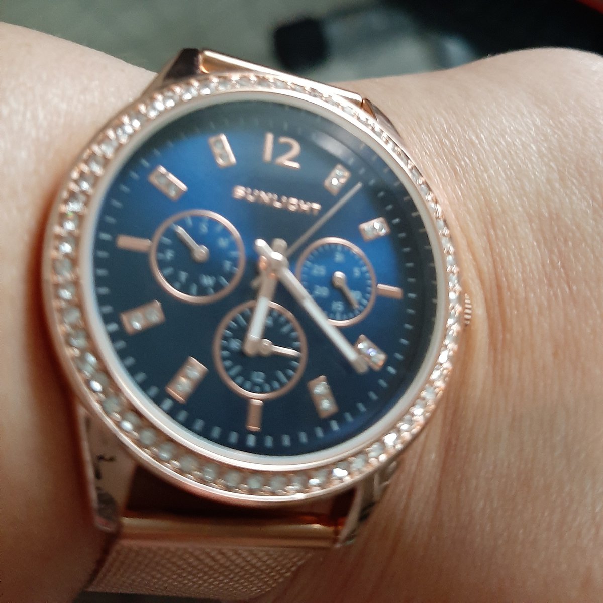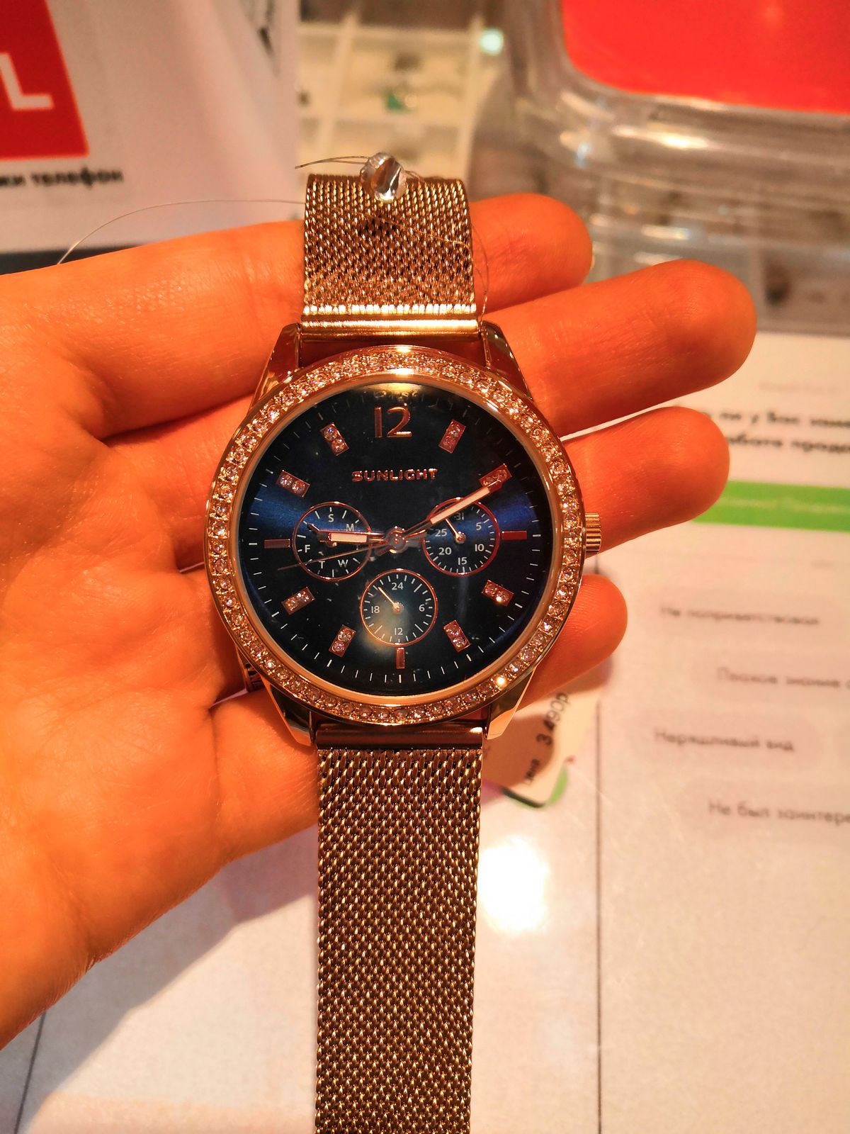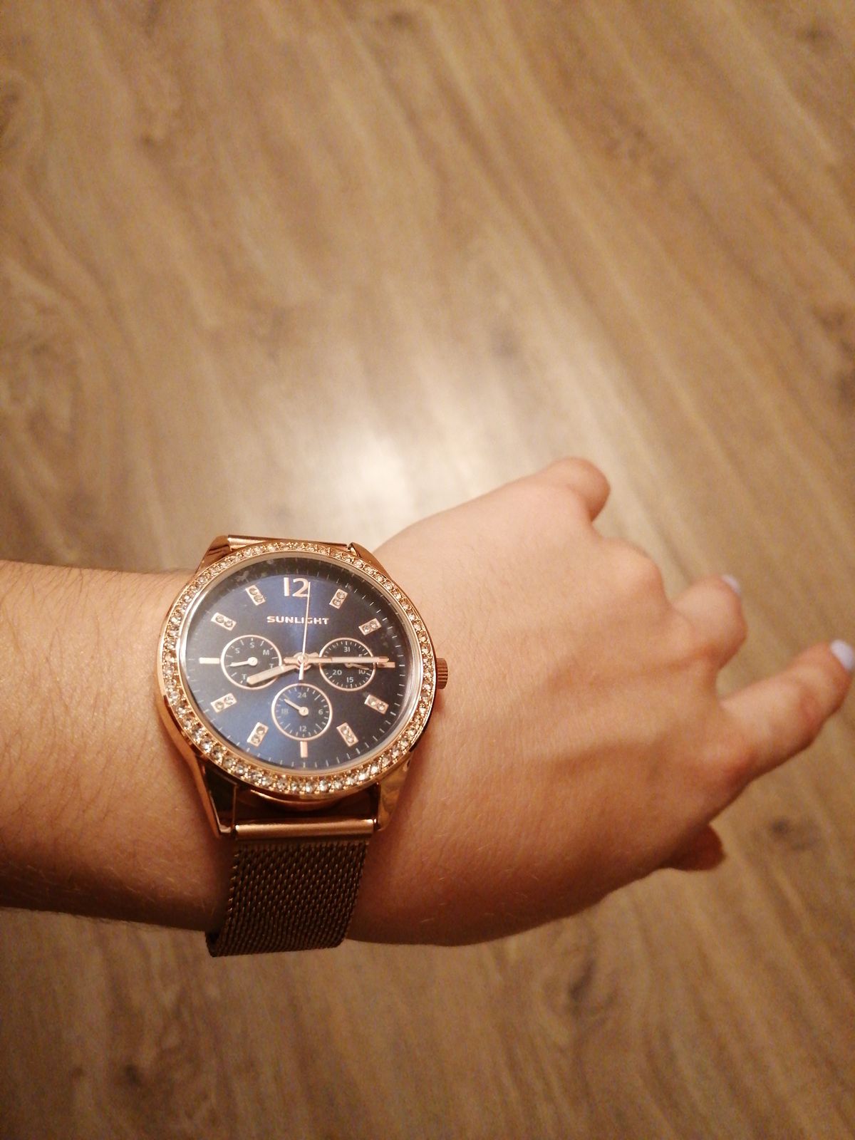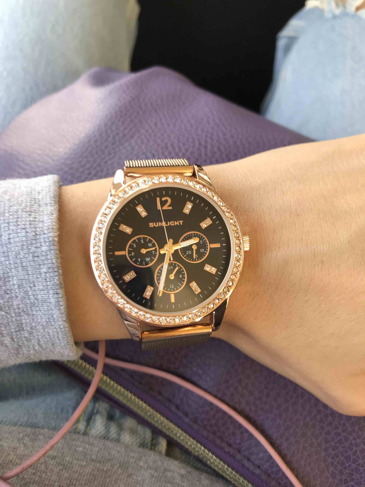 Блестит всё ,стрелки светятся, циферблат красивого синего цвета, дизайн отличный. Даже на самую маленькую ручку пойдут. Станут достойным аксессуаром к любому стилю. Увидела и влюбилась! Брала в магазине, девочки консультанты молодцы! Спасибо, Санлайту!