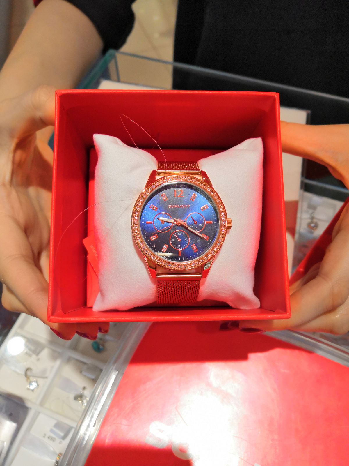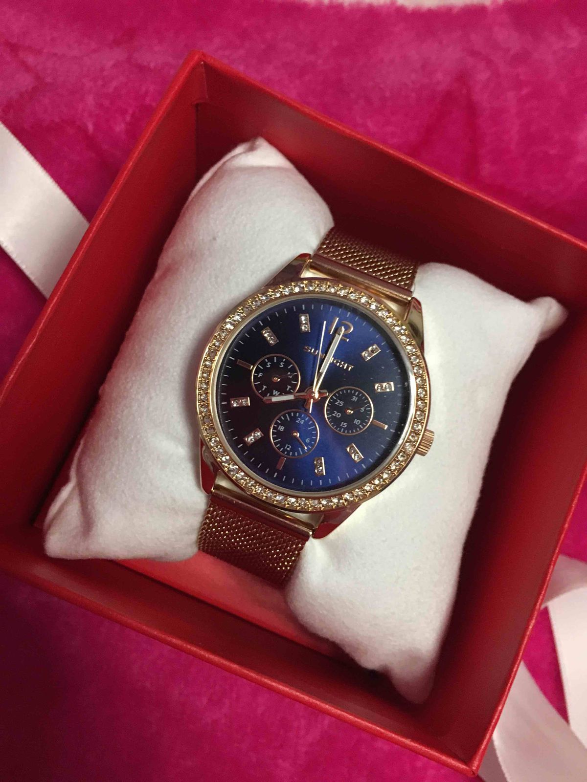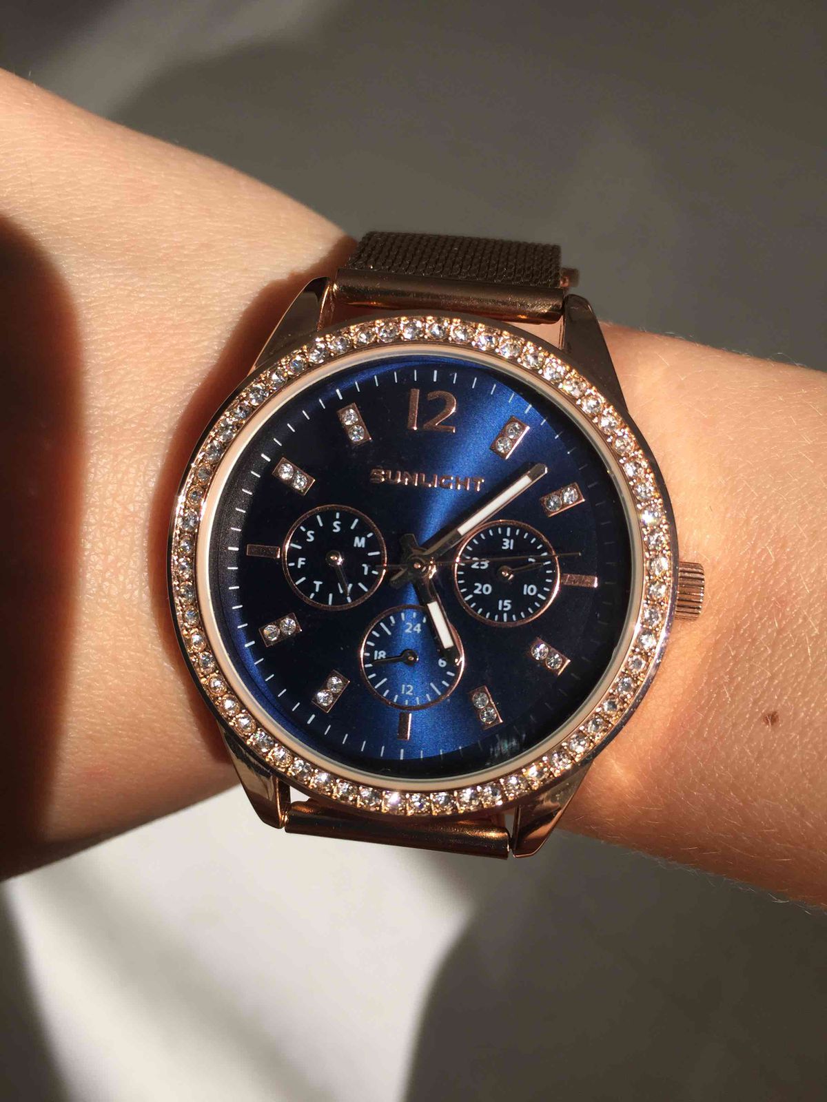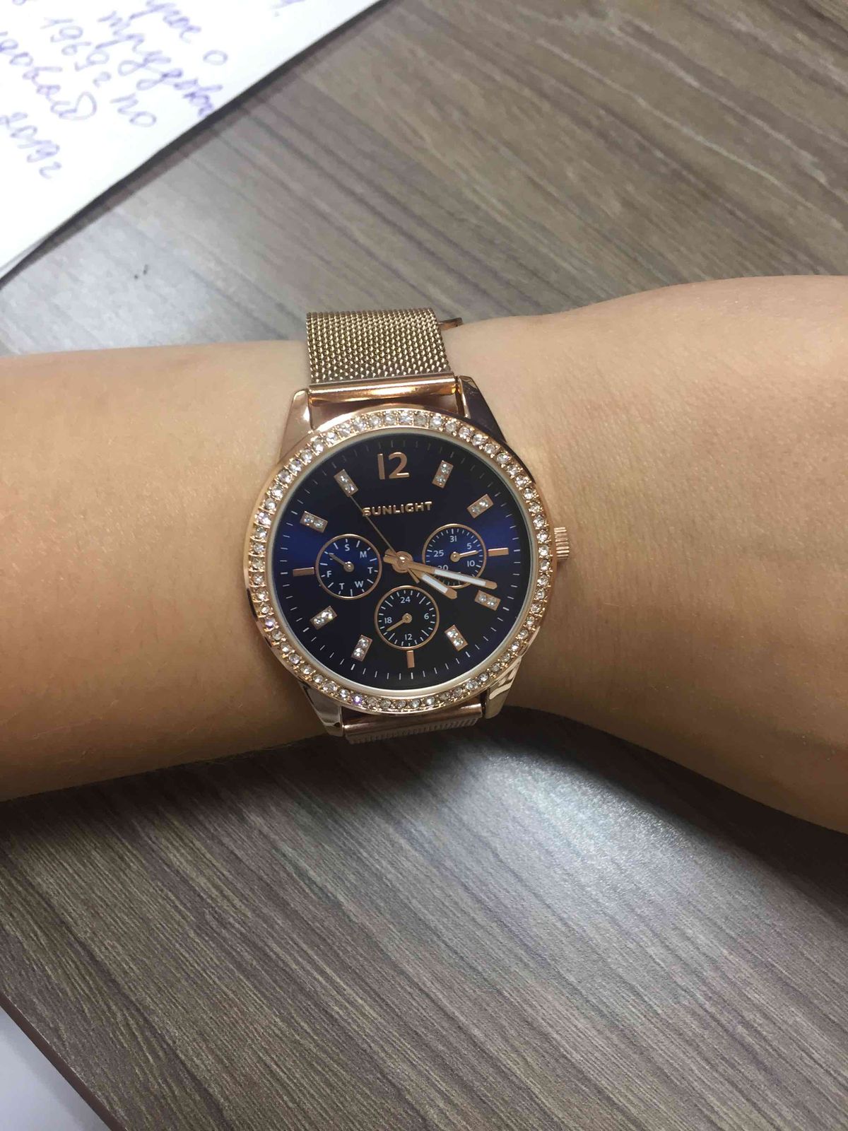 Блестит всё ,стрелки светятся, циферблат красивого синего цвета, дизайн отличный. Даже на самую маленькую ручку пойдут. Станут достойным аксессуаром к любому стилю. Увидела и влюбилась! Брала в магазине, девочки консультанты молодцы! Спасибо, Санлайту!