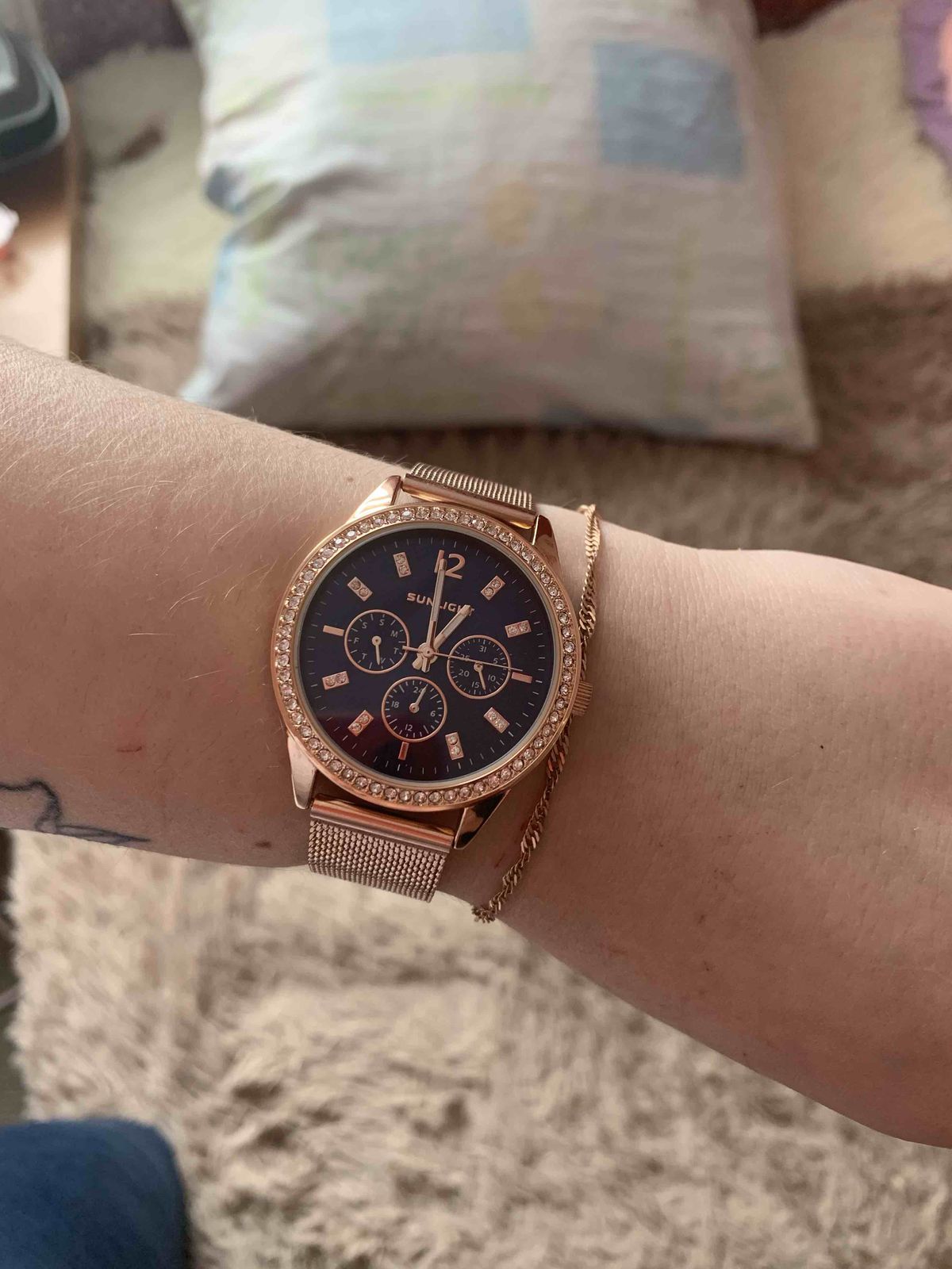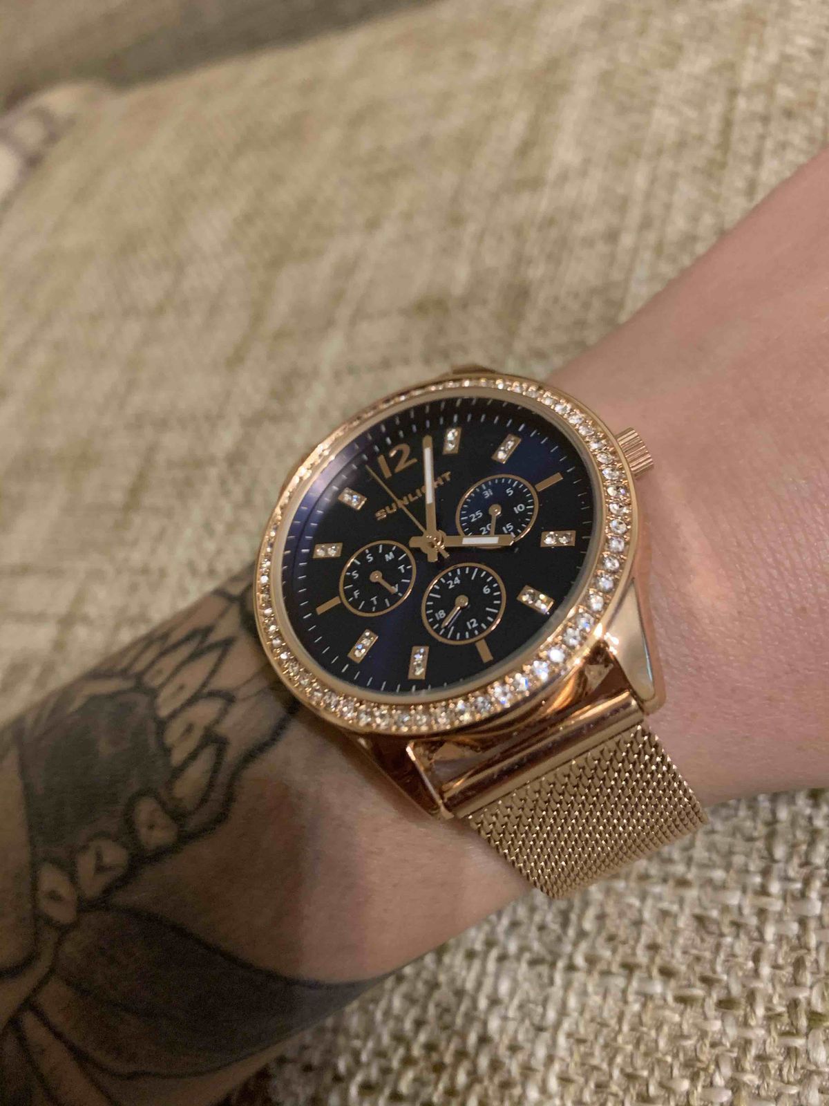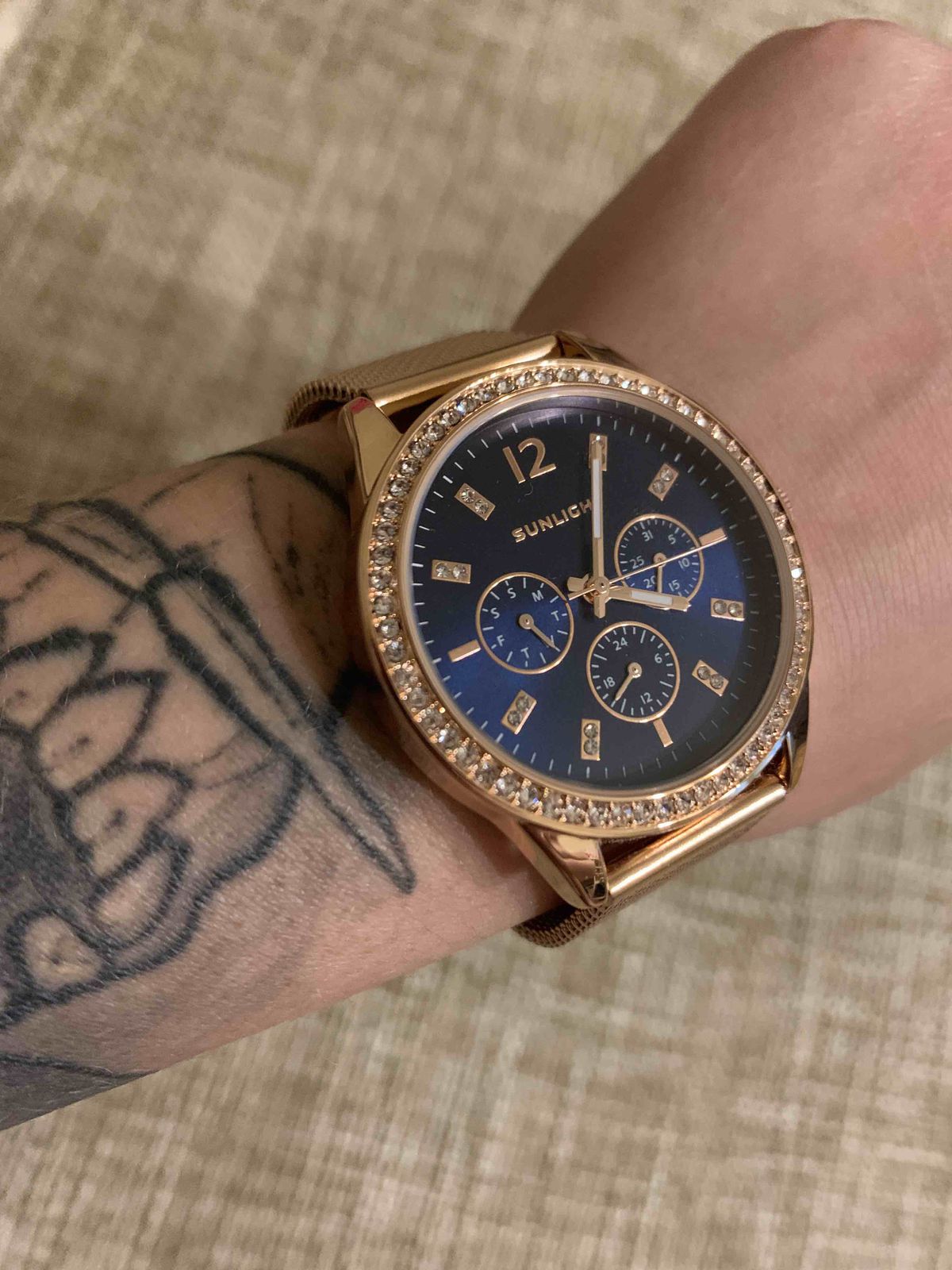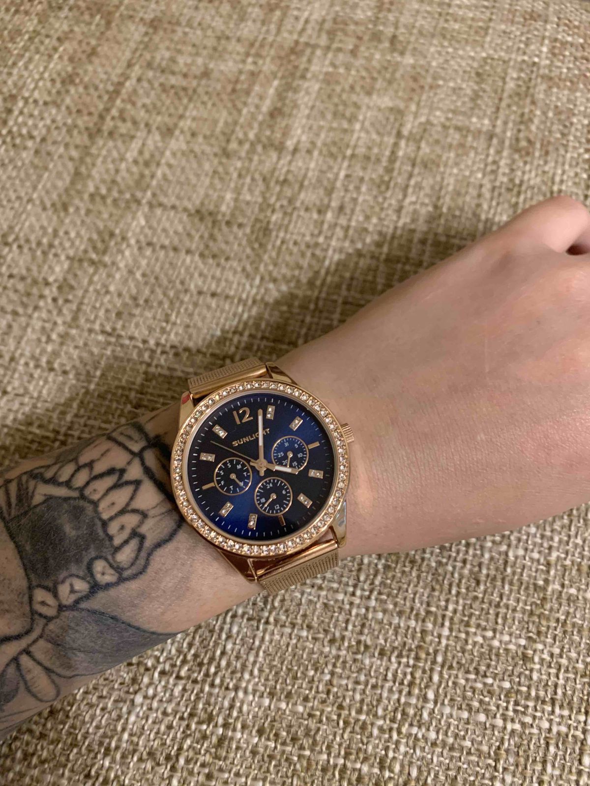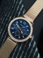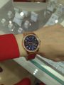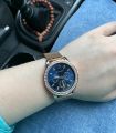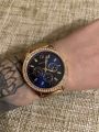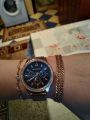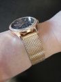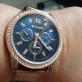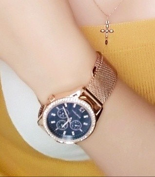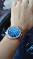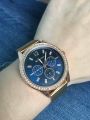 Специально взяла эту модель под цвет золотых украшений. Смотрятся дорого, стразы красиво переливаются на солнце. Очень стильно смотрится циферблат синего цвета, выгодно оттеняет цвет самих часов.