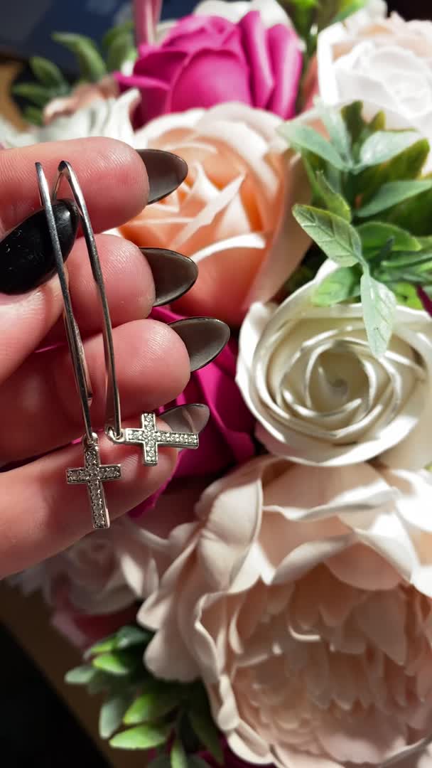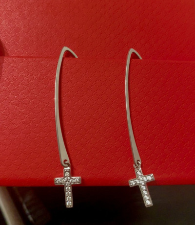 Люблю крупные,висячие,крестик мелковат.Но за счет дизайна и неординарной модели очень понравились.Без застежки,но держаться очень хорошо.Фианитик блестит словно бриллиантик.