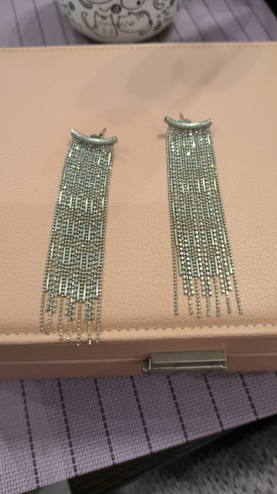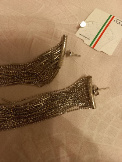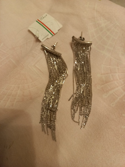 Итальянские серебряные серьги похожи на дождик. Крепятся на гвоздики. Тяжёлые, но красивые. Для вечерних выходов.