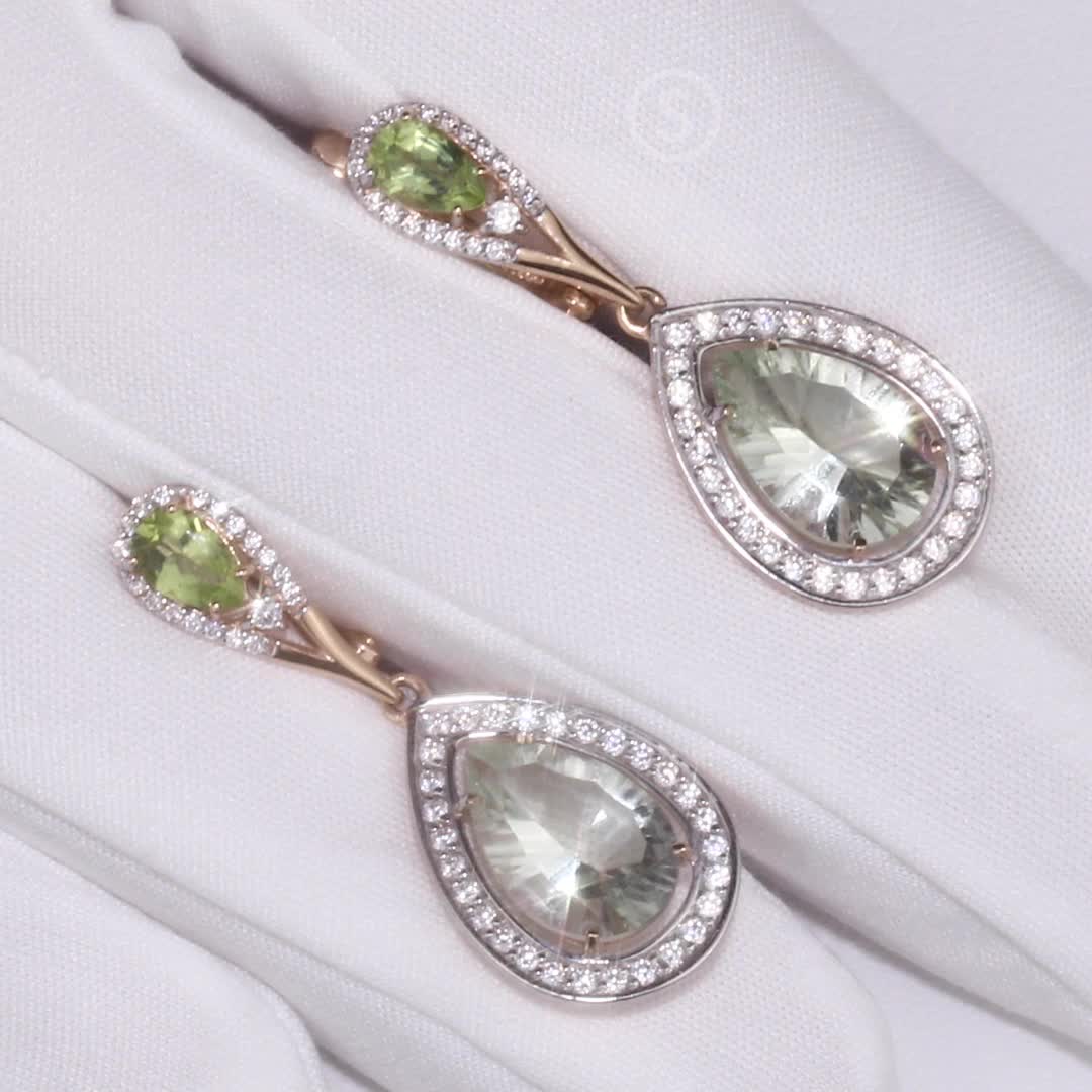 Золотые серьги с фианитами, аметистами природными и хризолитами природными