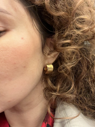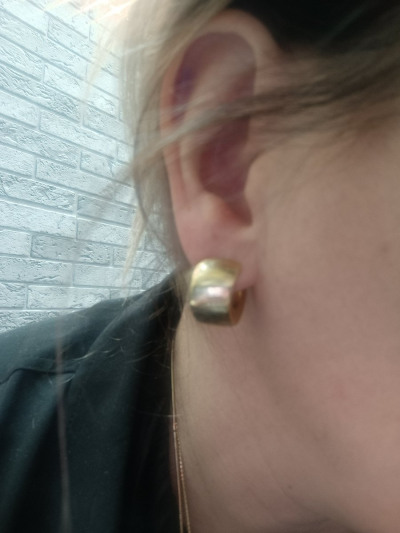 Итальянское серебро с позолотой лимонного оттенка. Интересная модель, на ушках смотрятся аккуратно. Но для толстой мочки уха не подойдут.