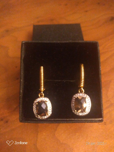 Прекрасные серьги с раухтопазами и фианитами. В реальности они намного интереснее, чем на фото или видео. Сочетание позолоты, темного раухтопаза и бесцветных фианитов делает это ювелирное изделие очень ярким и эффектным. Подвесная часть сережек в движении создает дополнительную игру камней. После покупки этих сережек я заказала еще кольцо такого же дизайна. Думаю, что комплект получится просто великолепным.
