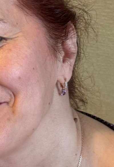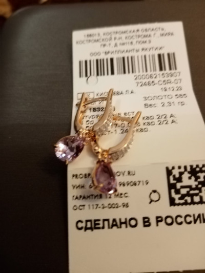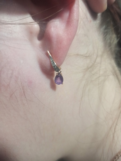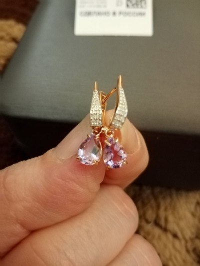 Серьги миниатюрные, на тонкие мочки только сядут, аметист очень бледный,практически не заметный, на сайте был представлен более насыщенного, яркого цвета, поэтому снимаю одну звезду. Серьги выигрывают только за счёт мелкой бриллиантовой россыпи, которая сверкает на свету. Серьги очень лёгкие, но на мочке посадка хорошая. В принципе качество соответствует своей цене с учётом всех скидок и акций.
