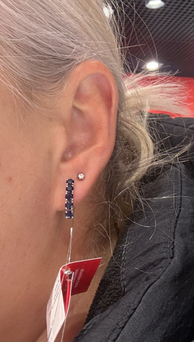 Сережки подбирала к кольцу из белого золота с сапфиром и бриллиантами. Очень понравились камни, они по размеру мне как раз подходили. Отличного цвета и прозрачности. Хороший надежный английский замок, а также отличное родирование, от белого золота не отличить. Рекомендую тем, кто любит стильные и минималистичные украшения. Смотрятся очень дорого и строго.