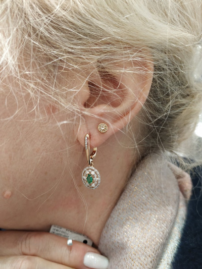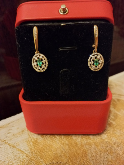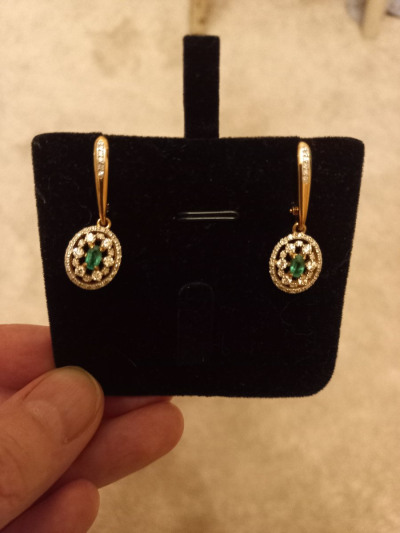 Очень красивые серьги с изумрудом и бриллиантами. Необычные. Нежные. Как только увидели, сразу приобрели. Такая модель встречается редко. Царские. Брюлики крупные 57 граней. В середине изумруд яркий, красивого цвета в окружении бриллиантов.