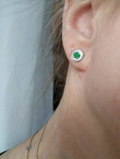 Серьги смотрятся нежно и изысканно. Благодаря изумруду становятся акцентными, хорошо подчёркивают цвет серых глаз. Лёгкие, удобные. Застёжка винтовая, как я люблю.